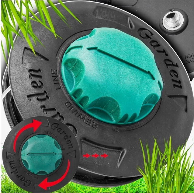 Завантаження риболовної лінії дуже просто і приємне - це ніколи не було таким простим. Оператор проводить риболовну лінію через переповнення, вимірюючи її відповідну довжину. Потім він перетворює нижнє зелене стебло, тримаючи верхню частину голови, а лінія вітається всередині нього автоматично без розстебання. Товсті та тверді алюмінієві викиди є м'якими для риболовної лінії, а ціла виготовлена з ABS -пластикової стійкої до розтріскування. Нова, універсальна головка для використання у кожному внутрішньому згоряльному коси