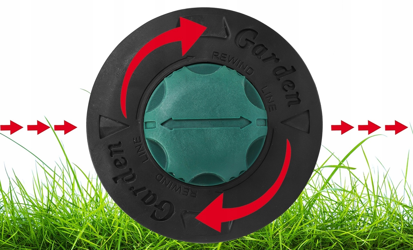 , щоб пробити рибальську лінію через направляючі для завантаження голови, встановлену, скручуючи стрілку напрямку на зеленому стеблі зі знаком стрілки на чорному корпусу - вони збігаються в одному лінії