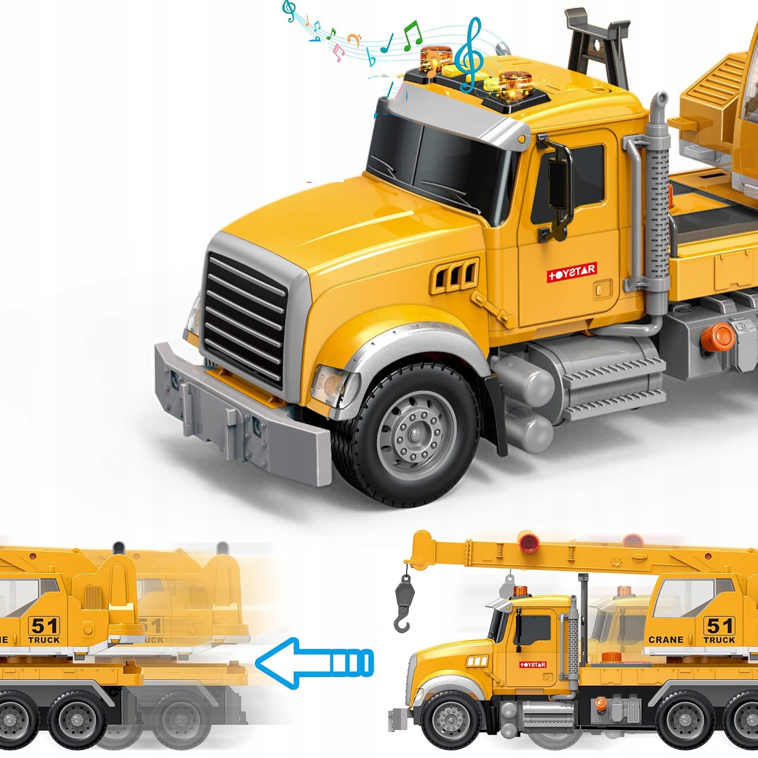 🚧Світло та звуки:Просто натисніть кнопку на голові автомобіля, і наш кран буде видавати яскраве світло, приємні звуки, і діти почують захоплюючу гарну музику, яка дуже приваблива для дітей, що граються.