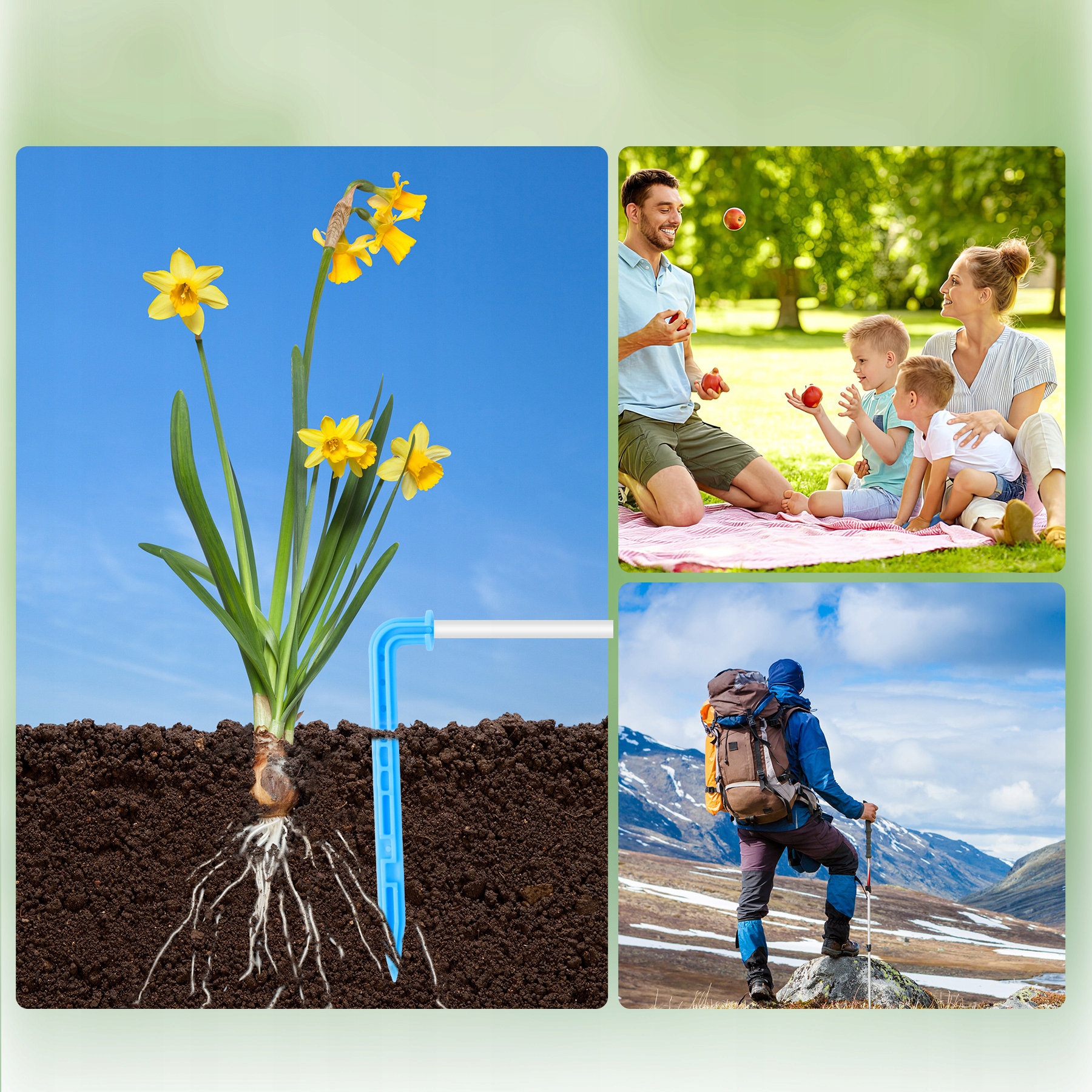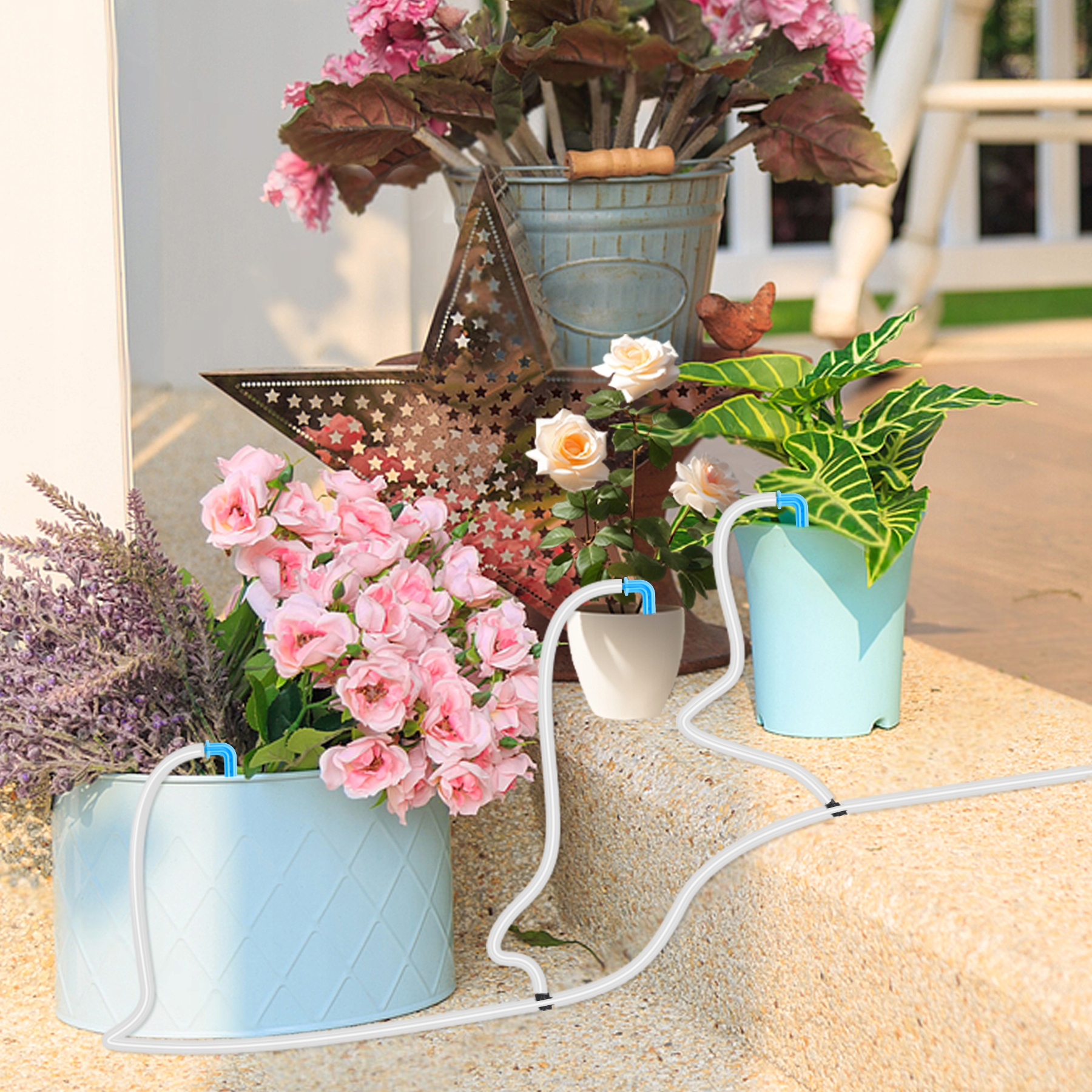 Система крапельного зрошення може рівномірно поливати до 10 горщиків з рослинами та доставляє воду безпосередньо до коренів рослин, тому вода може повністю поглинатися, а втрати води мінімізовані. У порівнянні зі звичайними методами поливу ви можете заощадити до 70% води.
