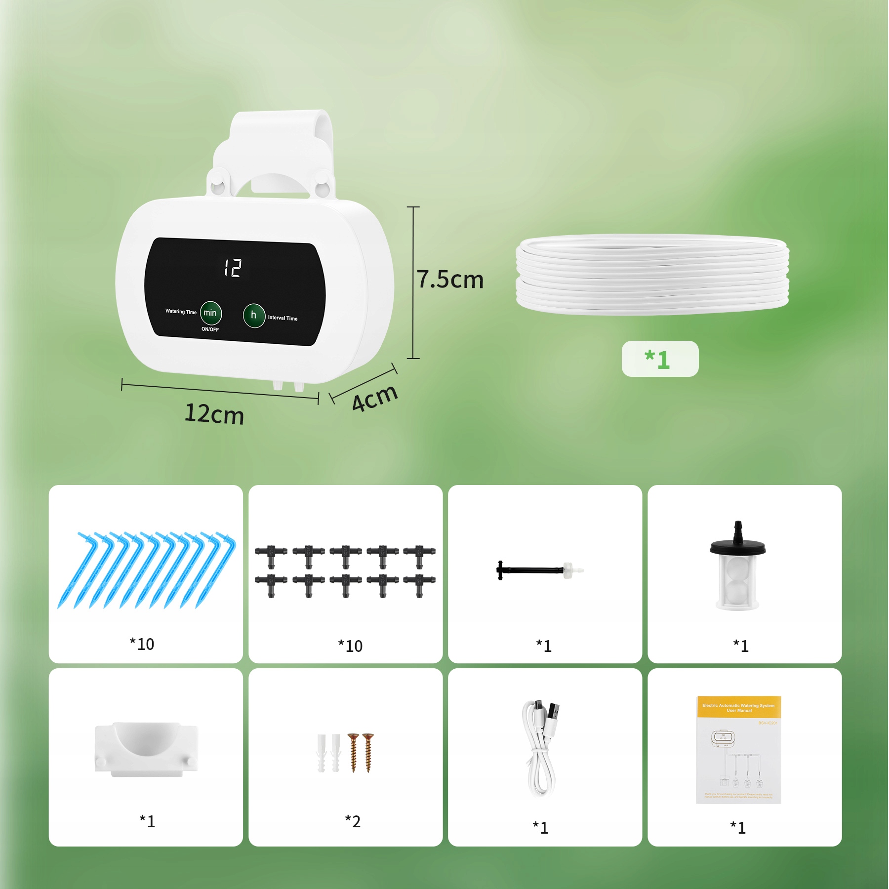 До комплекту системи крапельного поливу входять: крапельниця, 10-метровий шланг, штекер заземлення*10, трійник*10, антисифон*1, фільтр*1, монтажний кронштейн*1, гвинти*2, кабель для зарядки USB-C*1, посібник користувача*1. (Підказка: оскільки ми протестували всі продукти, це нормально, коли продукт пропускає воду зсередини.
