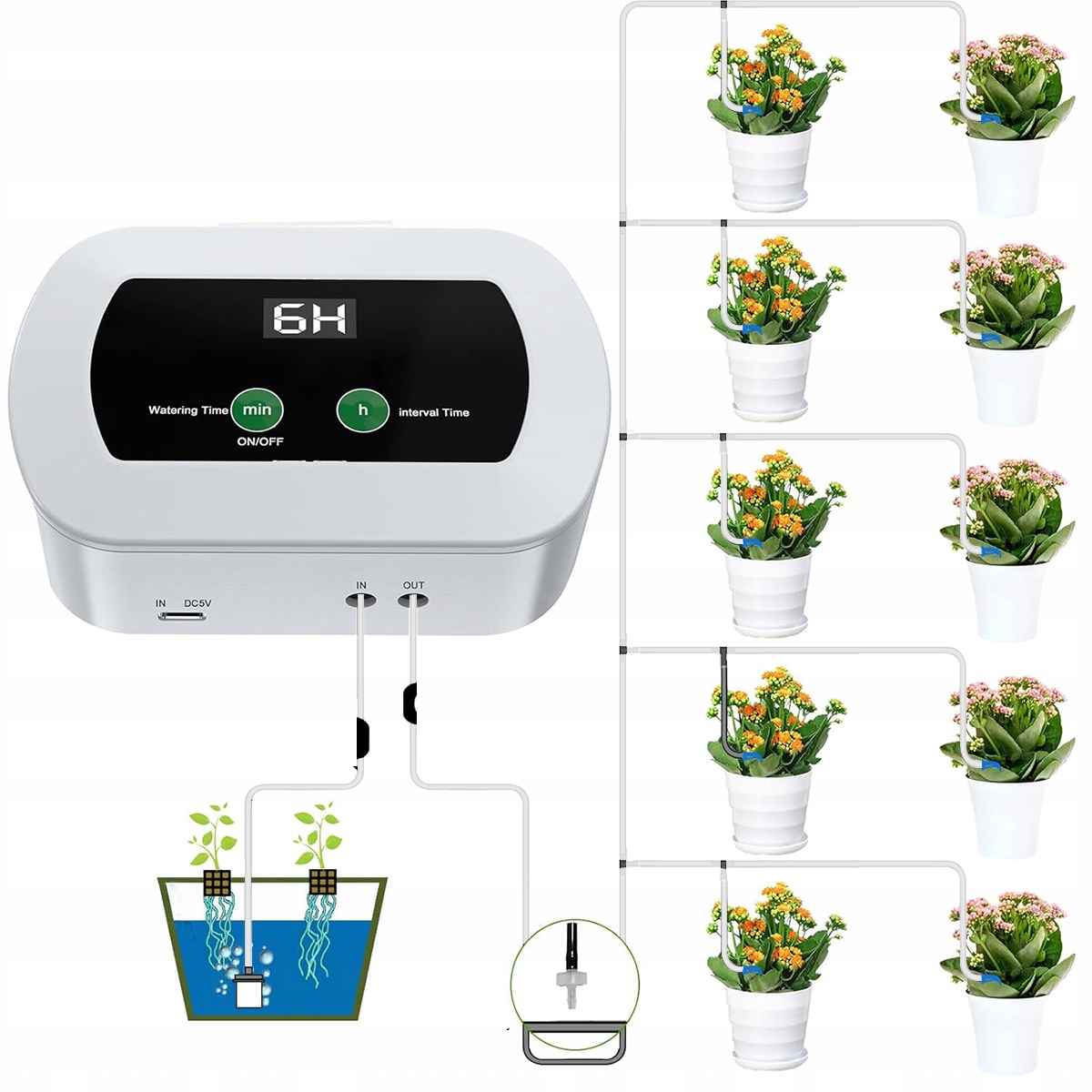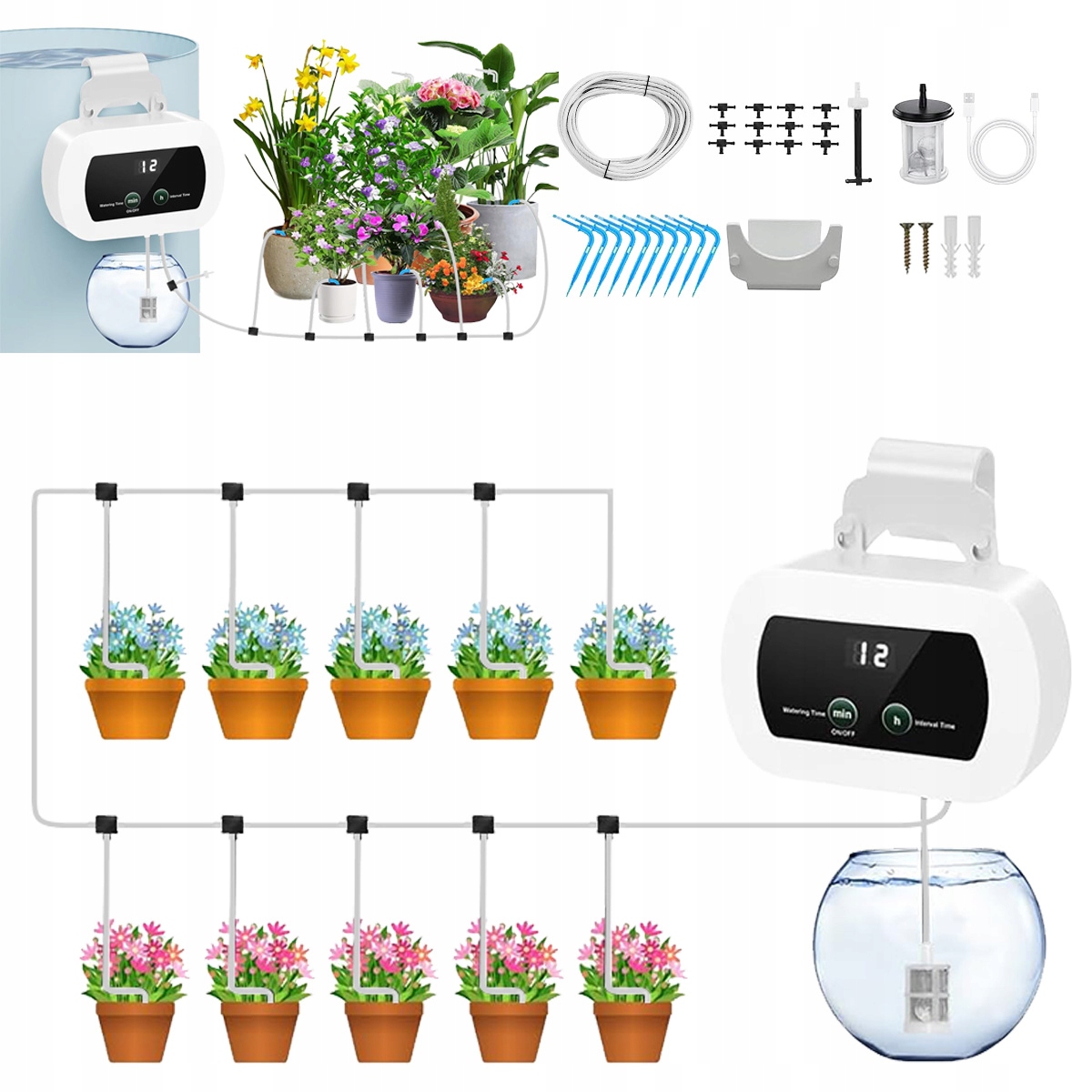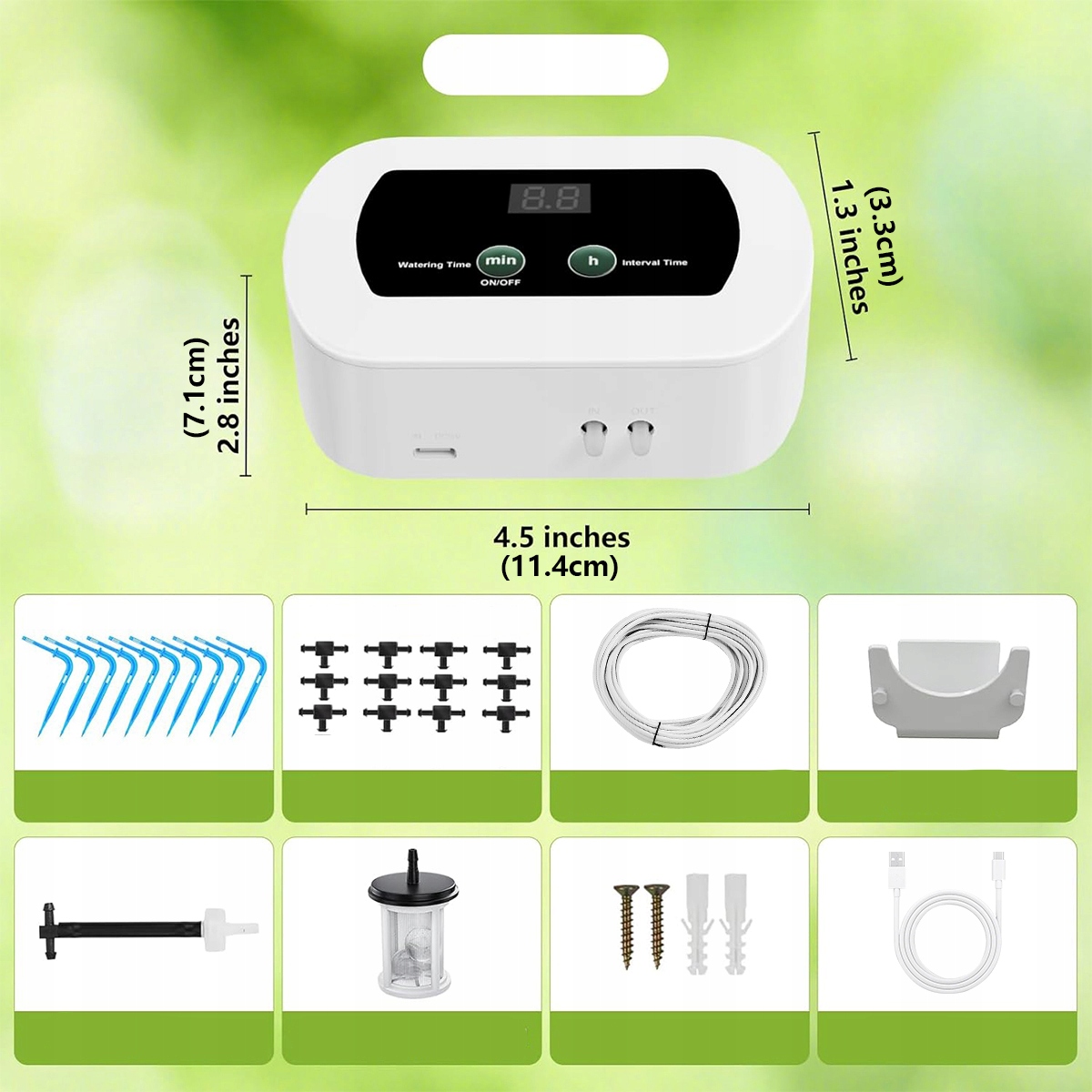 Набір для крапельного зрошення включає 1 інтегрований таймер водяного насоса, 1 10-метровий шланг, 10 заземлювальних вилок, 12 трійників, 1 антисифон, 1 фільтр, 1 настінний кронштейн, 1 набір гвинтів, 1 зарядний кабель USB Type-C та інструкції.