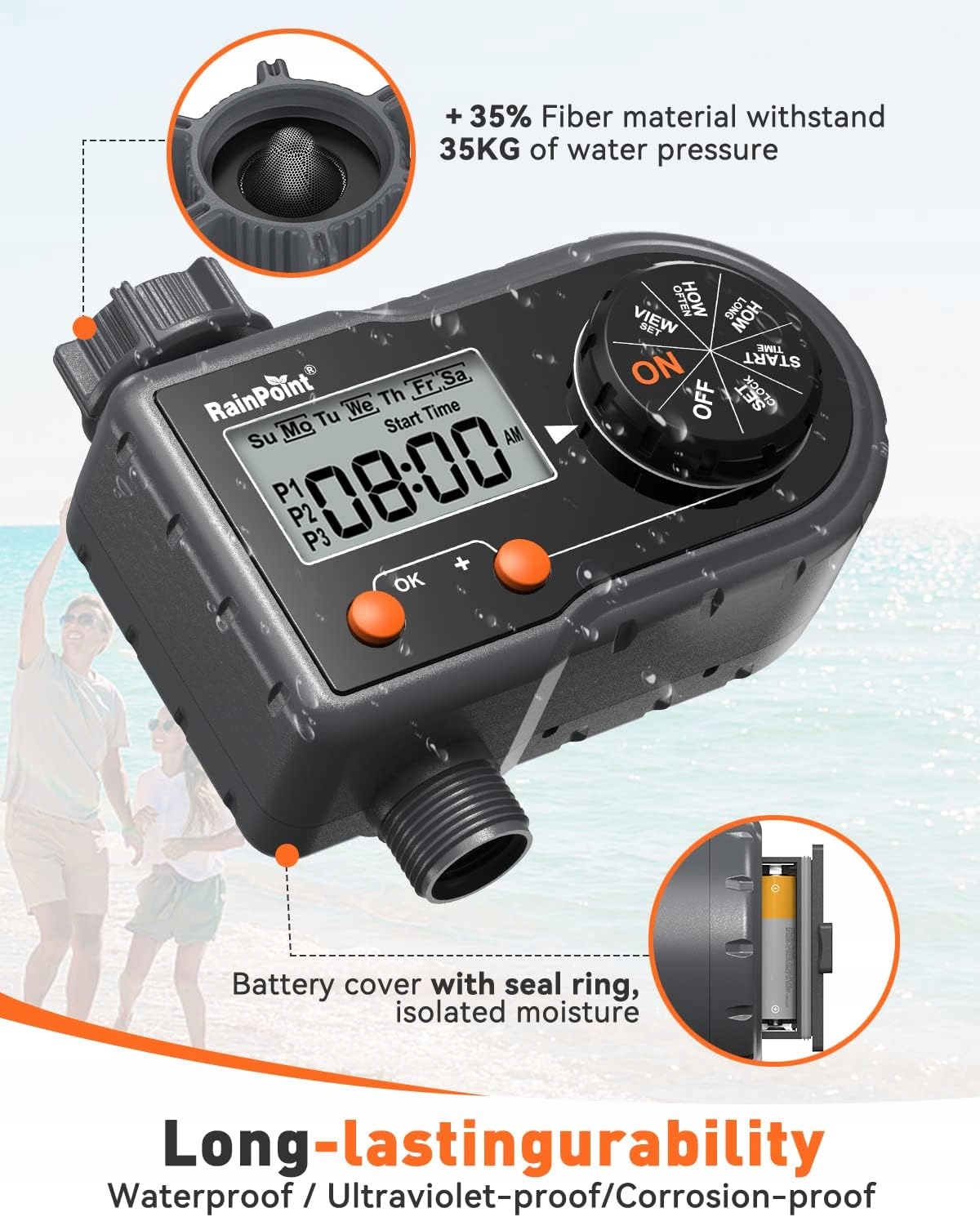 Водонепроникність і міцність: ця спринклерна система водонепроникна за стандартом IP54 і підходить для тривалого використання поза приміщеннями. Комп’ютер для поливу RAINPOINT складається з високоякісних електронних компонентів і промислового ABS-пластику. Він надзвичайно міцний, стійкий до УФ-випромінювання, погодних умов і зберігає точний контроль протягом багатьох років. Ви можете розраховувати на роки надійного обслуговування для економії води та енергії.