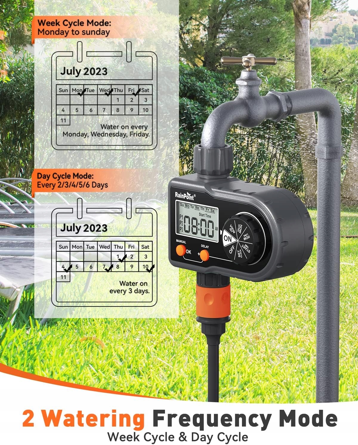 Застосування: Цей таймер поливу RAINPOINT для садових штанів можна використовувати для систем крапельного зрошення, зеленого мікрозрошення, спринклерного керування, систем туману та інших основних систем керування зовнішнім і внутрішнім зрошенням. Садова спринклерна система Rainpoint економить час і воду щодня. Вам не доведеться турбуватися про догляд за садом під час відпустки.