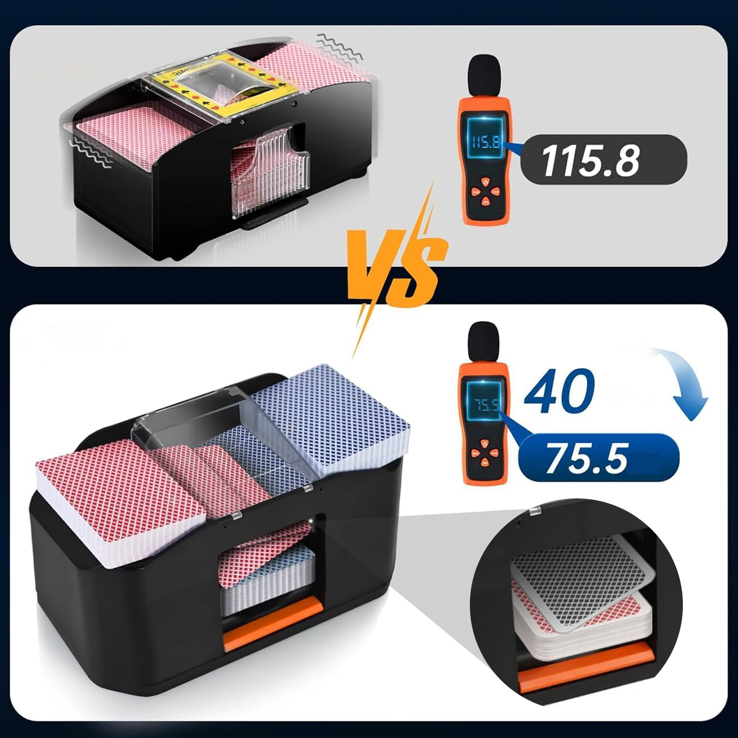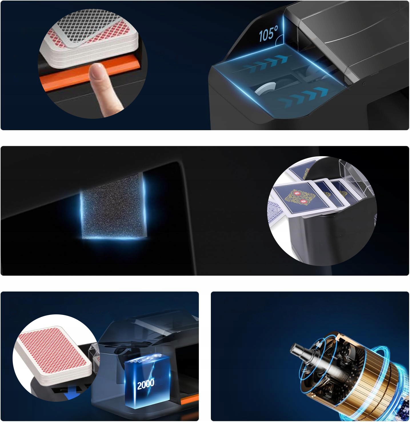 - оснащений високоефективним двигуном, працює зі швидкістю 10 000 об/хв, працює більш стабільним і може змішувати 2 набори карт всього за 2 секунди. Використовуйте його під час зарядки, щоб забезпечити безперебійну гру.