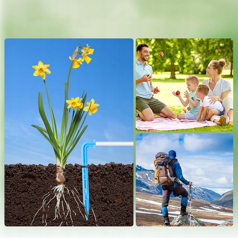 На відміну від інших зрошувальних систем, ця система використовує сильніший насос, щоб забезпечити навіть поливу до 10 горщиків. Підходить для поливу газонів, внутрішнього дворика, саду, овочів, підвісних кошиків, горщиків, квіткових грядів, оранжерних тощо, щоб покращити ріст рослин, повільно і рівномірно.