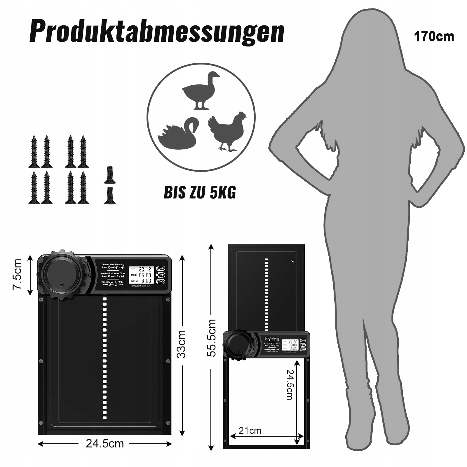 【Удосконалена технологія захисту від захоплення】: наші двері оснащені передовою технологією захисту від захоплення. Якщо під час зачинення буде виявлено курку або іншу перешкоду, двері зупиняться на 13 секунд. Якщо перешкода не зникне, двері відчиняться, зачекайте 10 секунд і спробуйте знову зачинитися. Це гарантує, що курчата залишаться неушкодженими.