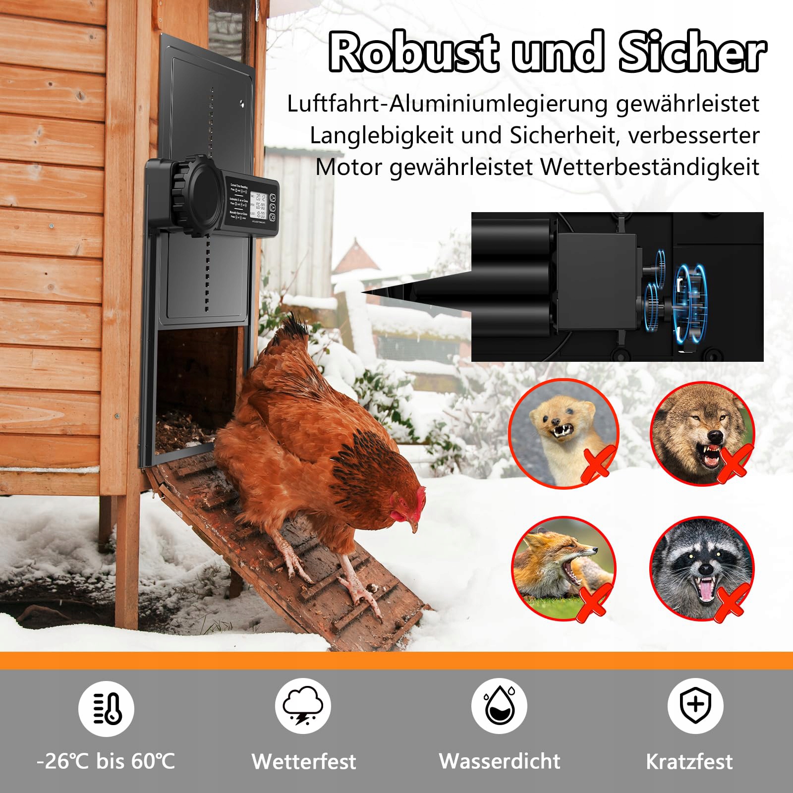 【Довше живе акумулятор за будь-якої погоди】: на відміну від сонячних батарей альтернативи живленню, наші двері для курятника працюють безперебійно завдяки 3 батареям типу АА і забезпечують 180 днів безперервного використання (БАТАРЕЯ НЕ ВХОДИТЬ!!!). Водонепроникність підвищена до IPX6, тому двері курятника працюють оптимально – під дощем, снігом чи сонцем.