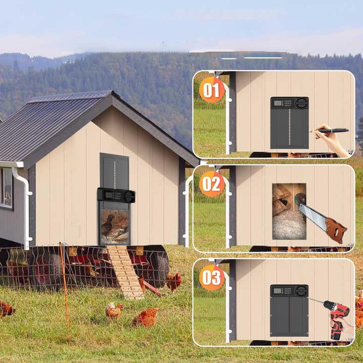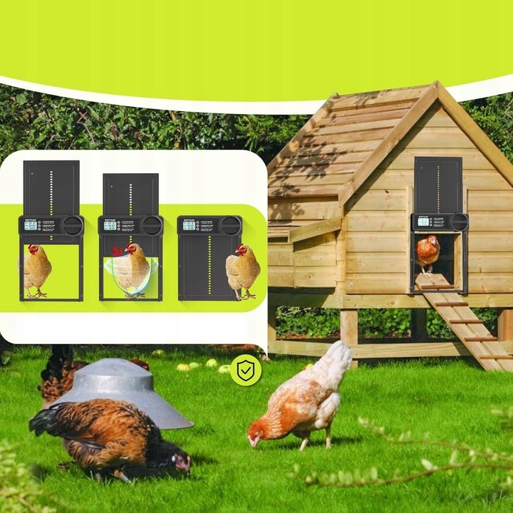 Автоматичні двері до курки з інтегрованими РК -екранами дозволяють легко регулювати та регулювати час відкриття та закриття. Це гарантує зручність та точність та усуває всю невизначеність.
