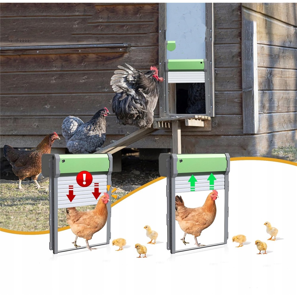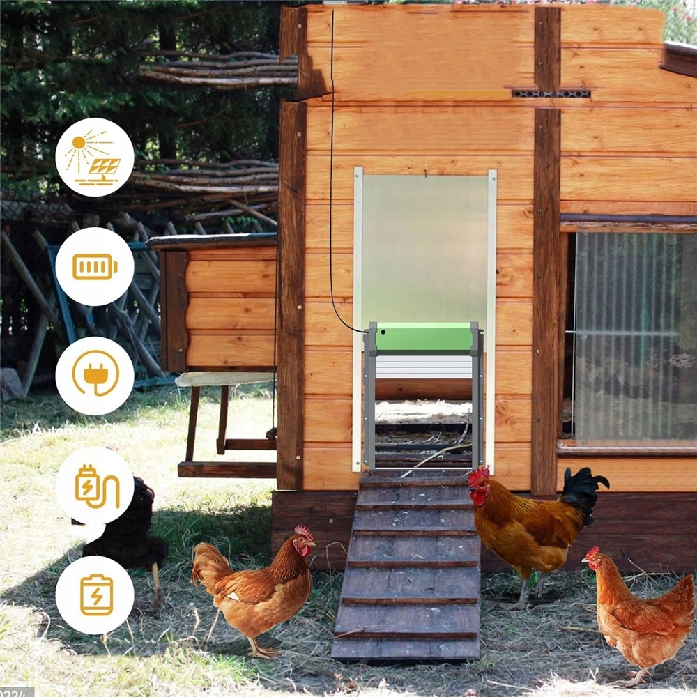 [Дверцята для курятника на сонячних батареях]: автоматичні двері для курятника мають вбудовану батарею на 2000 мАг, яка підтримує зарядку через USB і сонячну енергію. Екологічно чистий і ефективний, одного заряду вистачає на два місяці. Для отримання оптимальної сонячної ефективності встановлюйте панель у місці, де потрапляє пряме сонячне світло.