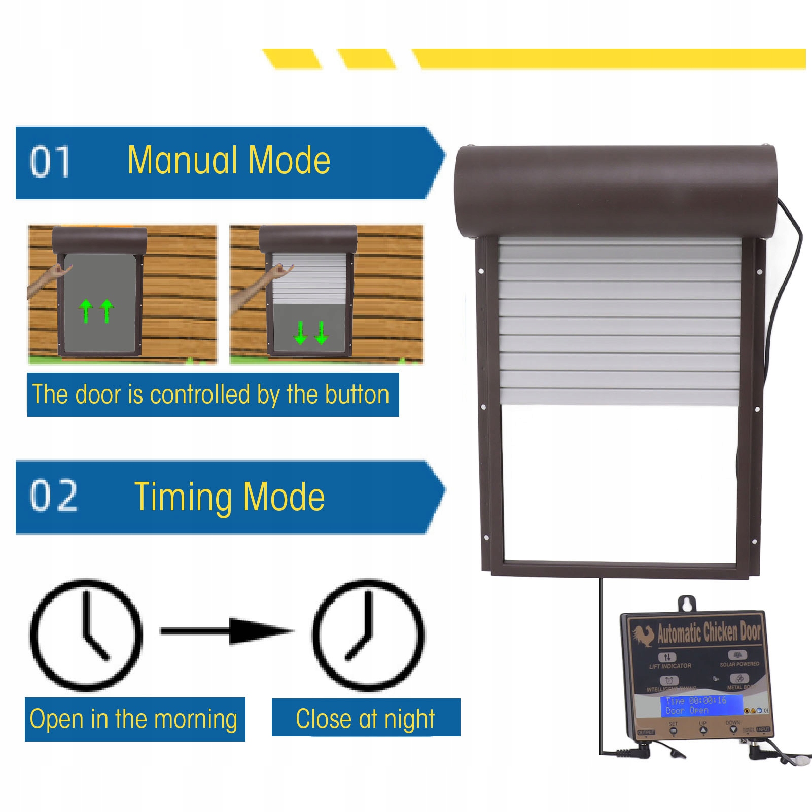 2. Режим синхронізації: поєднання режиму таймера та ручного режиму. Режим таймера передбачає ручне встановлення часу відкриття та закриття дверей курятника залежно від пори року, напрямку та регулярного часу входу та виходу курей у неволі. Зручне програмування кнопок. Автоматично відкривається вранці та автоматично закривається ввечері