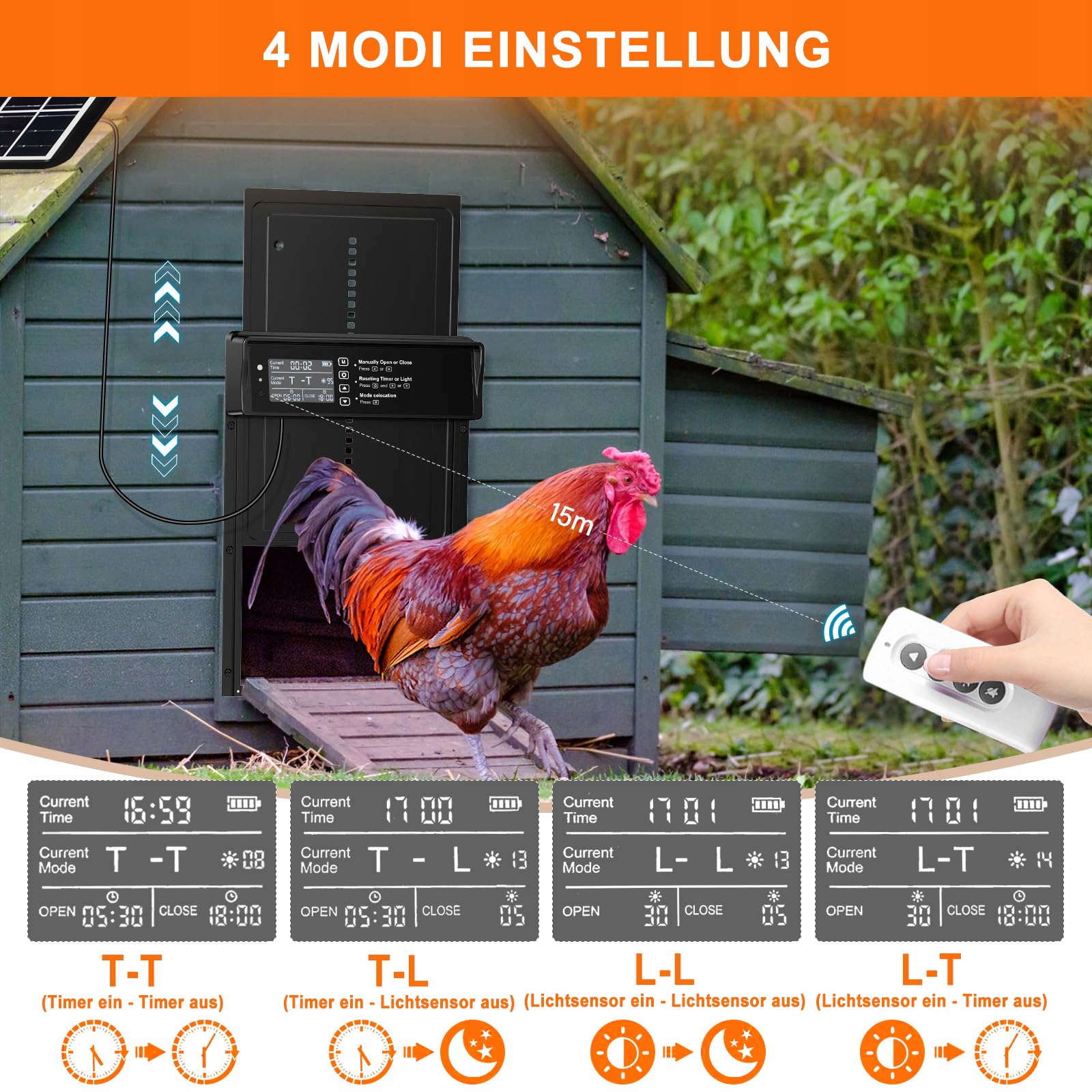 4 режими: Автоматичні двері до курки мають 4 режими: T-T (таймер on-timer вимкнено), T-l (датчик таймера на світлі), L-l (датчик датчика світла, що підтримується, вимкнено датчик світла). Ви можете встановити час відповідно до власних налаштувань. (У фоточутливому режимі реакція пристрою відбувається через щонайменше 30 секунд). Окрім діапазону температури, використовуйте ручний режим, щоб відкрити та закрити двері!