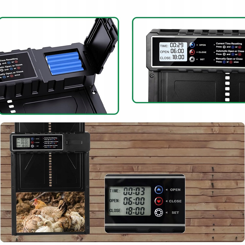 -hangs до двох режимів управління, режиму таймера та вручну режим, таймер може бути встановлений точно для автоматичного відкриття дверей вранці та закриття дверей ввечері. Птиця.