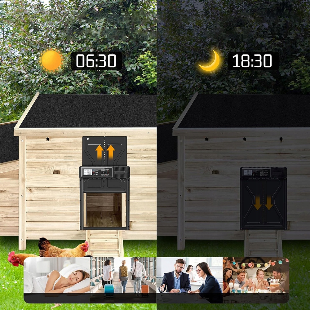 ☑automatic Doors до Henhouse з таймером/ручним режимом: Виберіть Налаштування ручного або таймера. Таймер може бути встановлений точно, автоматичне відкриття дверей вранці та автоматичне закриття ввечері. Незалежно від того, ви подорожуєте чи просто насолоджуєтесь спокійним ранком, ви можете бути впевнені, що ваші кури будуть почувати себе добре доглядати, не обмежуючи свій час і свободу.