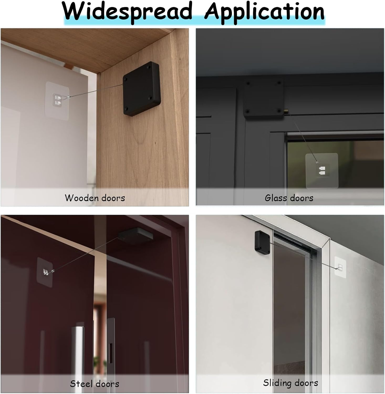 Двері, що ближче до дверей, були розроблені з метою максимальної установки. Завдяки сильній стрічці, збірка надзвичайно проста і не вимагає буріння або додаткових інструментів. Просто приклейте ближче до стіни, а спеціалізовану ручку на дверних крилах, а потім потягніть сталевий шнур і зачепіть його за ручку. Продукт повністю технічний і не вимагає додаткових джерел електроенергії, що робить його ідеальним вибором для кожного будинку.