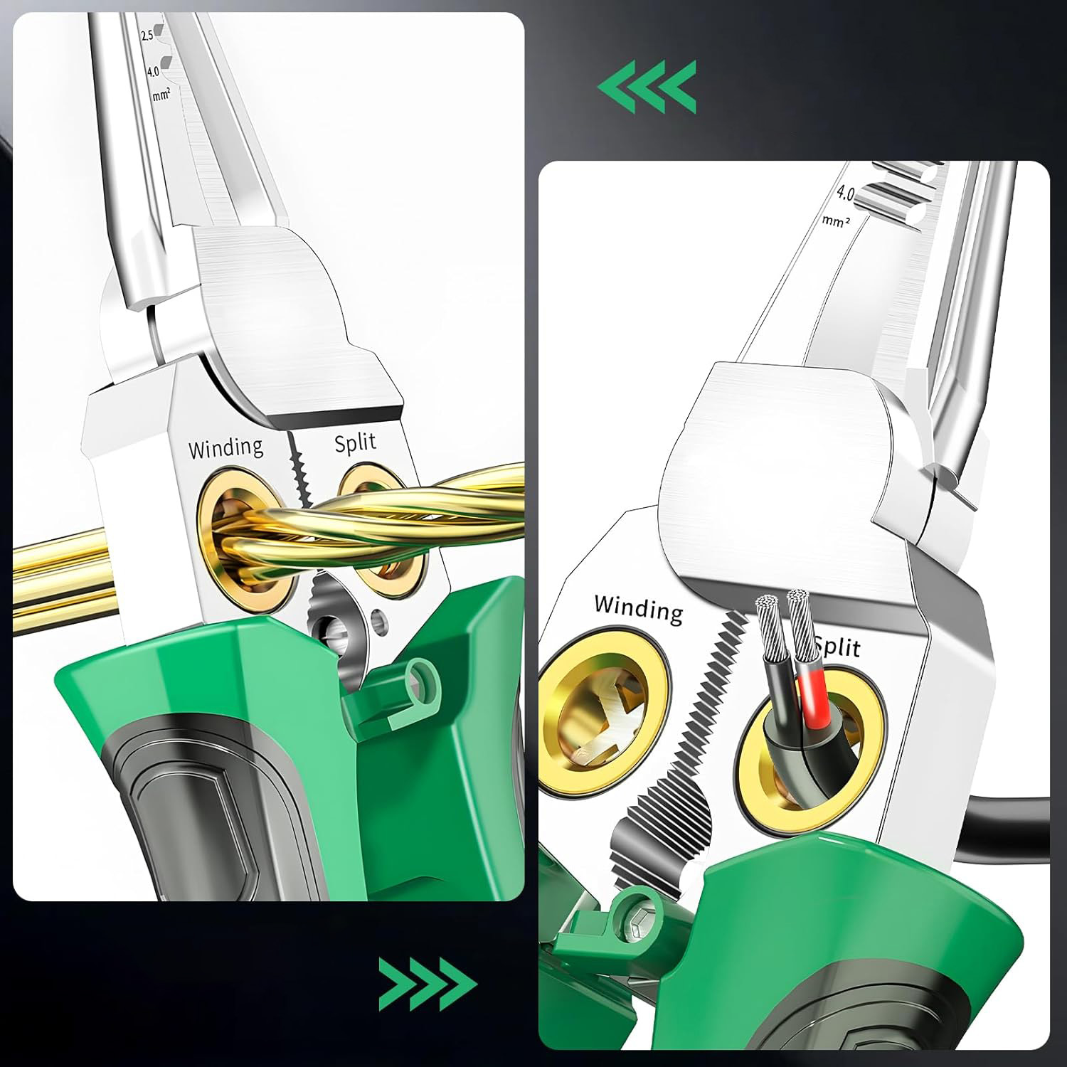 Засіб для зачистки дроту має зручну функцію визначення напруги для проводів AWG 18, 14, 12, 10, 6/1,0, 1,5, 2,0, 2,5, 4,0 мм², підходить для проводів 25 мм², можна розділити на 2 дроти по 1,5 мм².