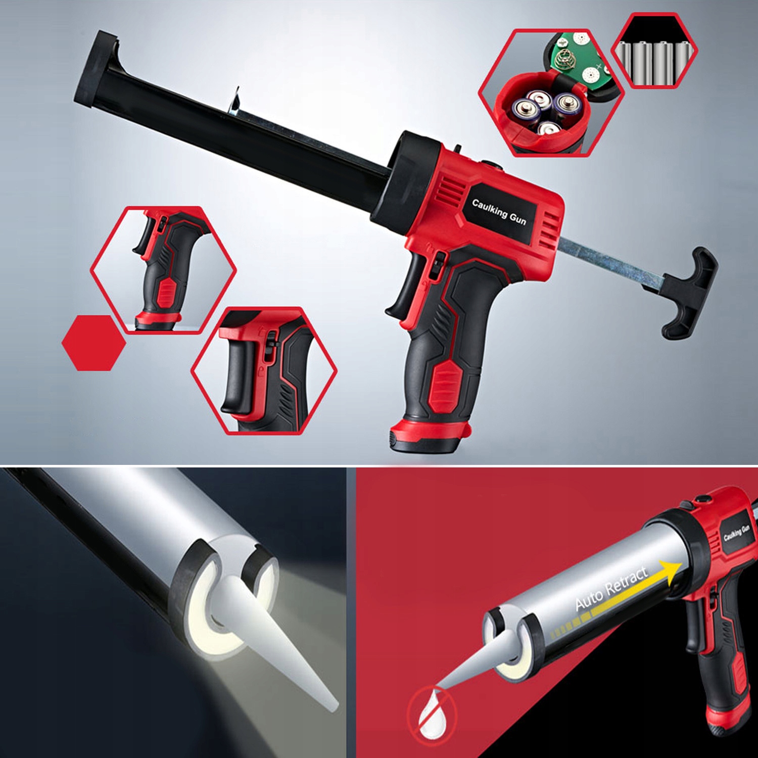 * Пістолет для ущільнення, що заощаджує час: живиться від 4 батарейок типу АА 1,5 В (не входять у комплект) і забезпечує час роботи понад 180 хвилин. Сила тиску 120 кг є достатньою, щоб задовольнити потреби у герметизації великих поверхонь. Прискорює герметизацію на 50% або більше.