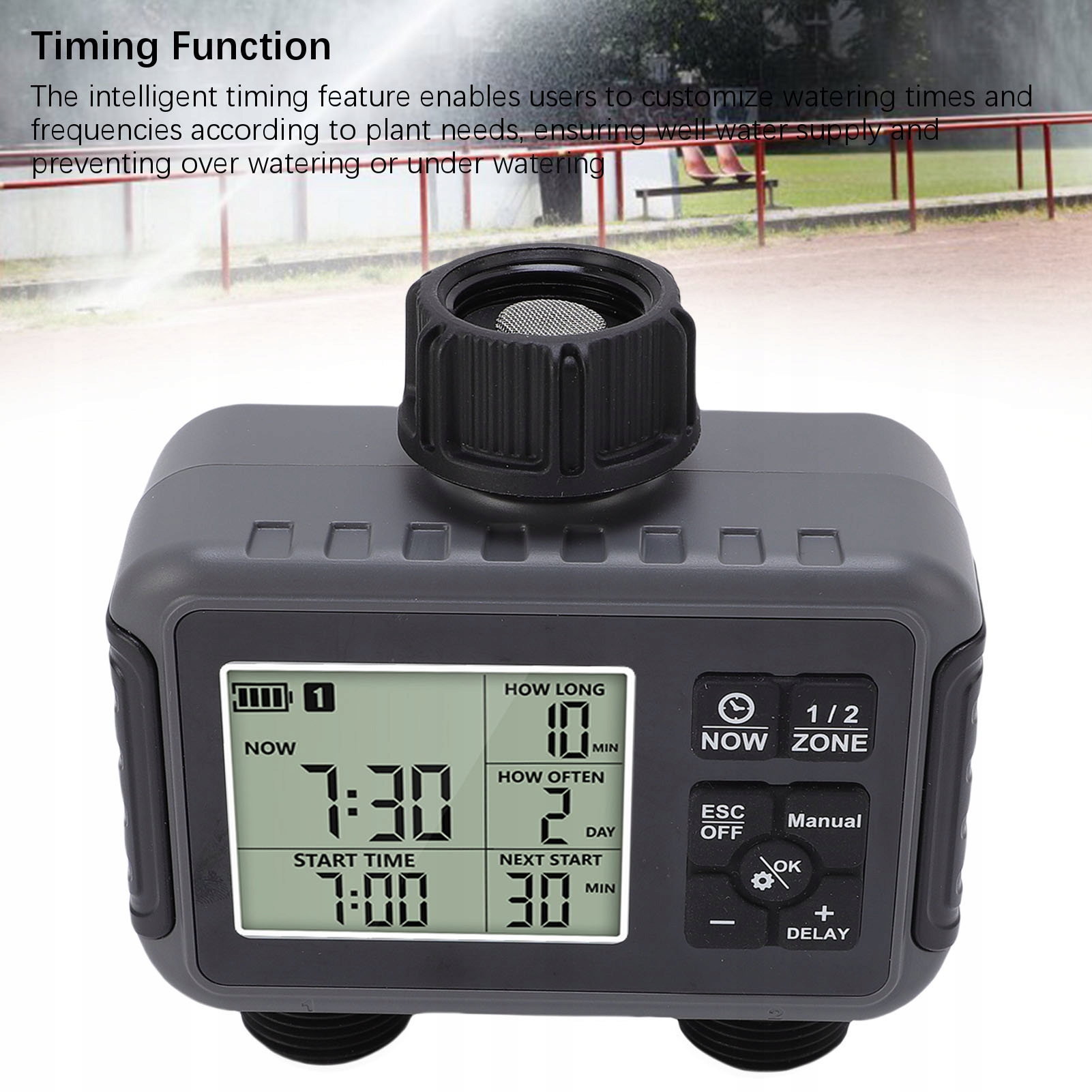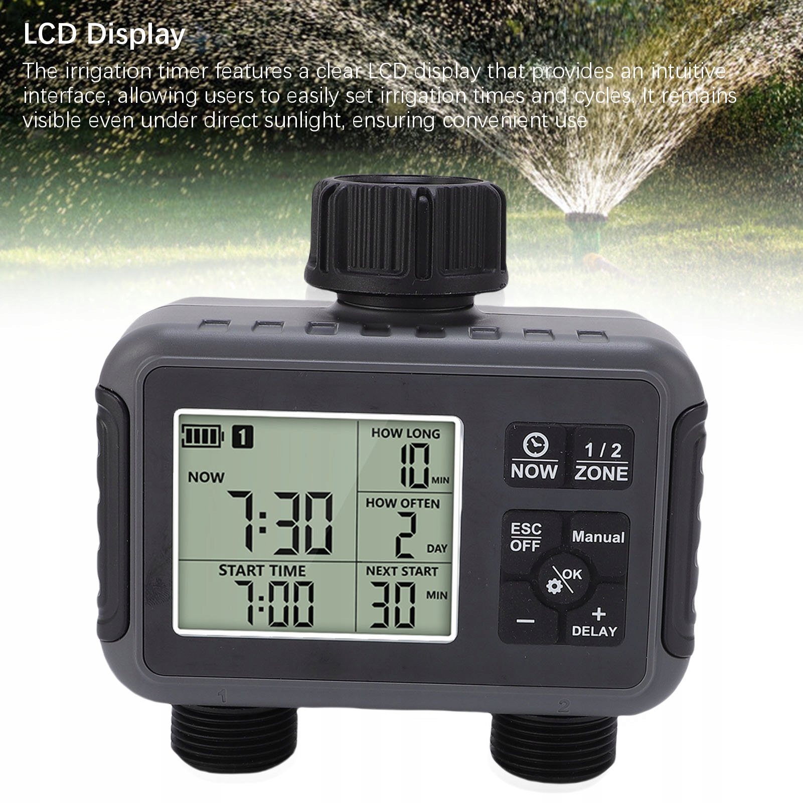 1. РК -дисплей: таймер зрошення має чіткий РК -дисплей, який забезпечує інтуїтивно зрозумілий інтерфейс, що дозволяє користувачам легко встановлювати час і цикли зрошення. Він залишається видимим навіть під прямим сонячним світлом, забезпечуючи комфортне використання