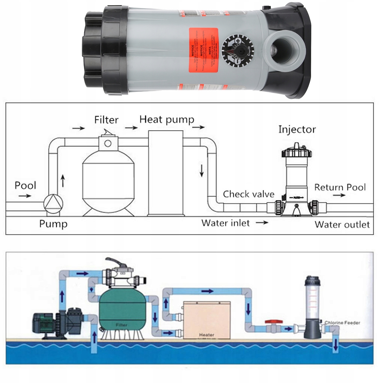 5. Повністю автоматична конструкція низького рівня води, коли насос припиняє працювати, рівень води автоматично знижується, щоб уникнути порушення гранул хлору.