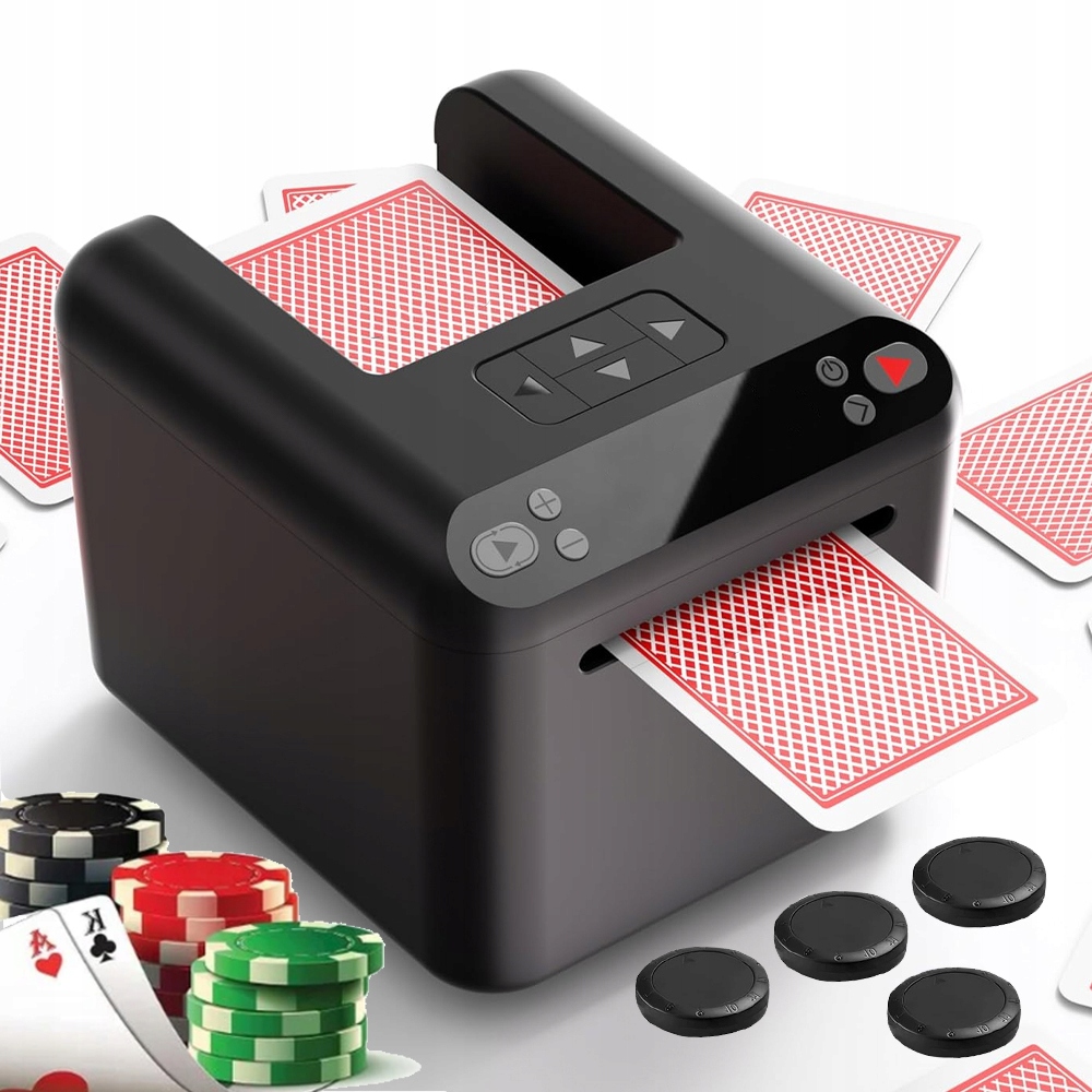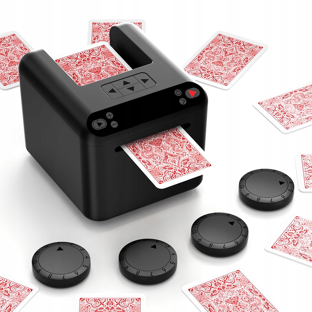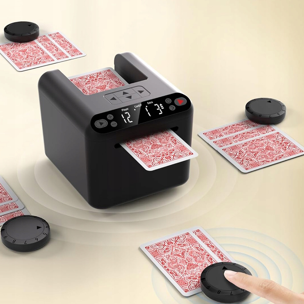 🥊⛳Пристрій для роздачі карт、режими роботи - індивідуальний режим, режим Texas Hold'em、конфігурації роздачі - 9 варіантів (кількість гравців до 12, кількість рук, загальні карти, випадковість, карти на руку, спосіб роздачі тощо)、елементи управління - 4 незалежні кнопки виклику (можливість об'єднання до 12), акумулятор 4000mAh、сумісність - карти міжнародного стандарту (покер 63.5мм88.9мм, міст 57мм88.9мм, UNO 87мм*56мм)、матеріал - пластик + електронні компоненти, чорний
