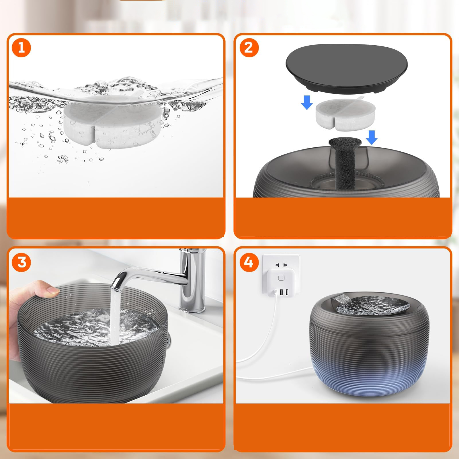Фонтан для домашніх тварин використовує систему циркуляції та фільтрації, яка використовує активоване вугілля, іонообмінну смолу та нетканий матеріал для видалення шерсті, бруду та залишків їжі, тому ваші улюблені домашні тварини завжди отримують свіжу та чисту воду.