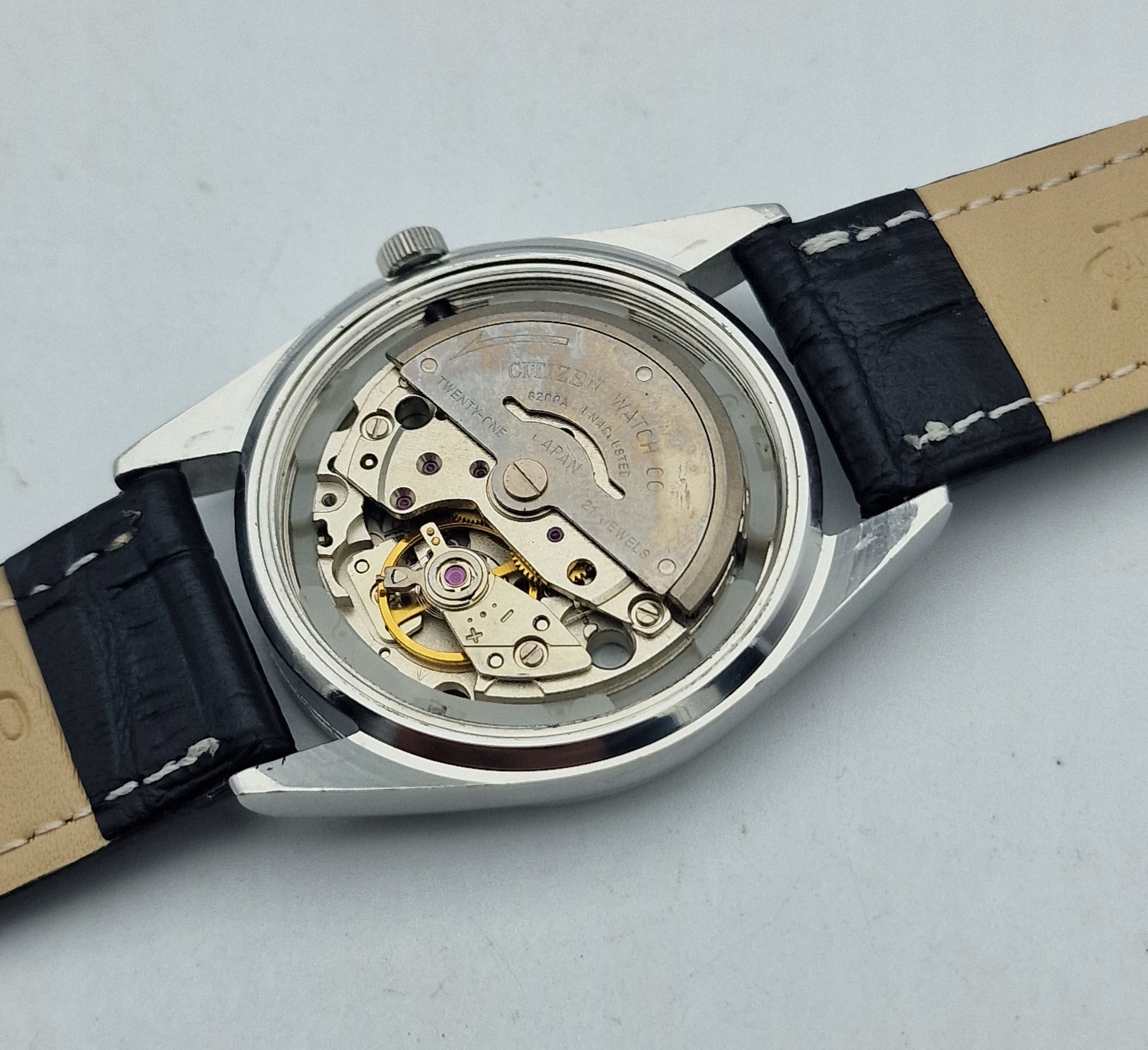 - Срібний металевий диск з датою на трьох годинах. Підписаний щит: " Citizen Automatic, 21 коштовності, Японія ". Щит у ідеальному стані, який представлений фотографіями аукціону.