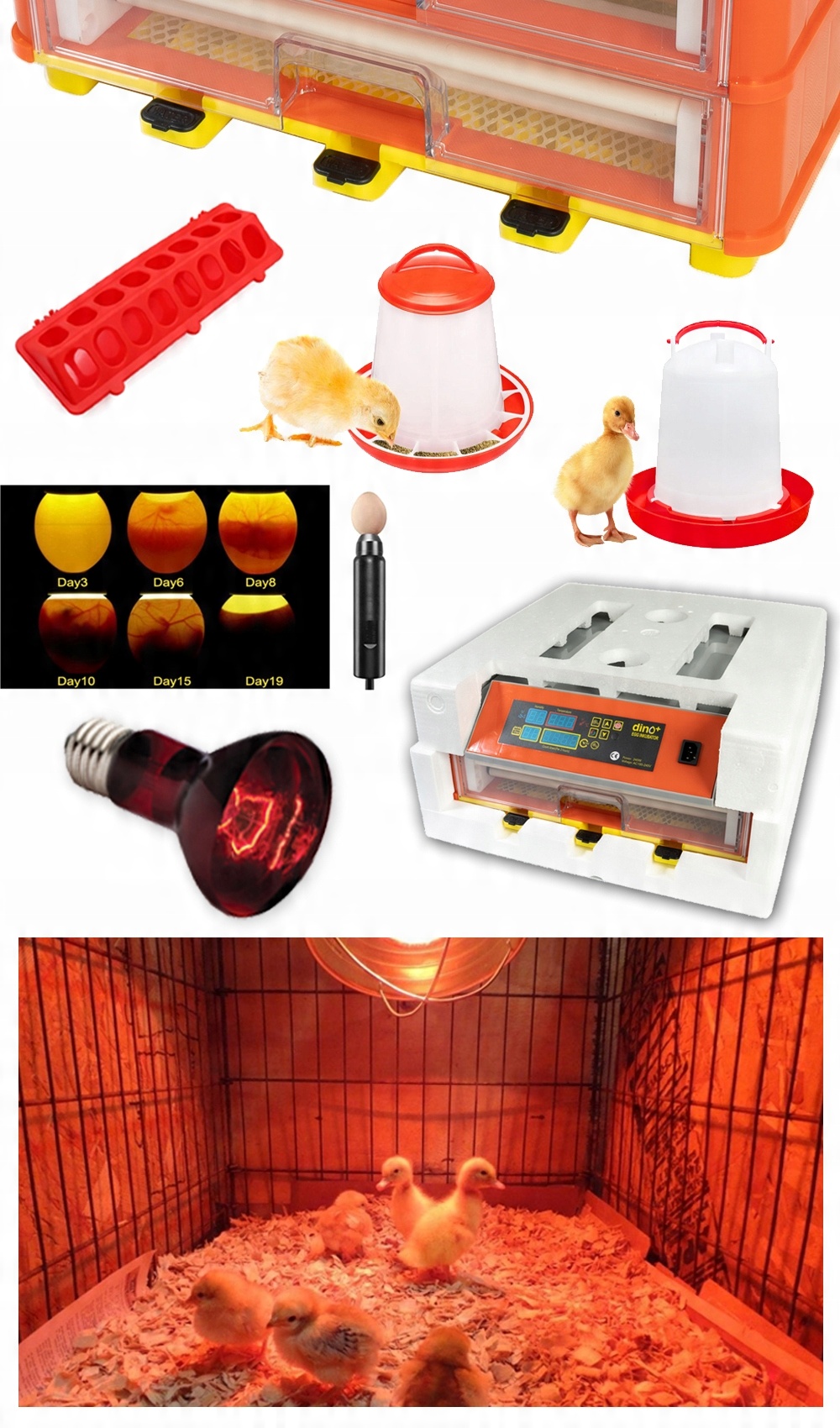 Набір необхідних аксесуарів для інкубації та вирощування птахів.
