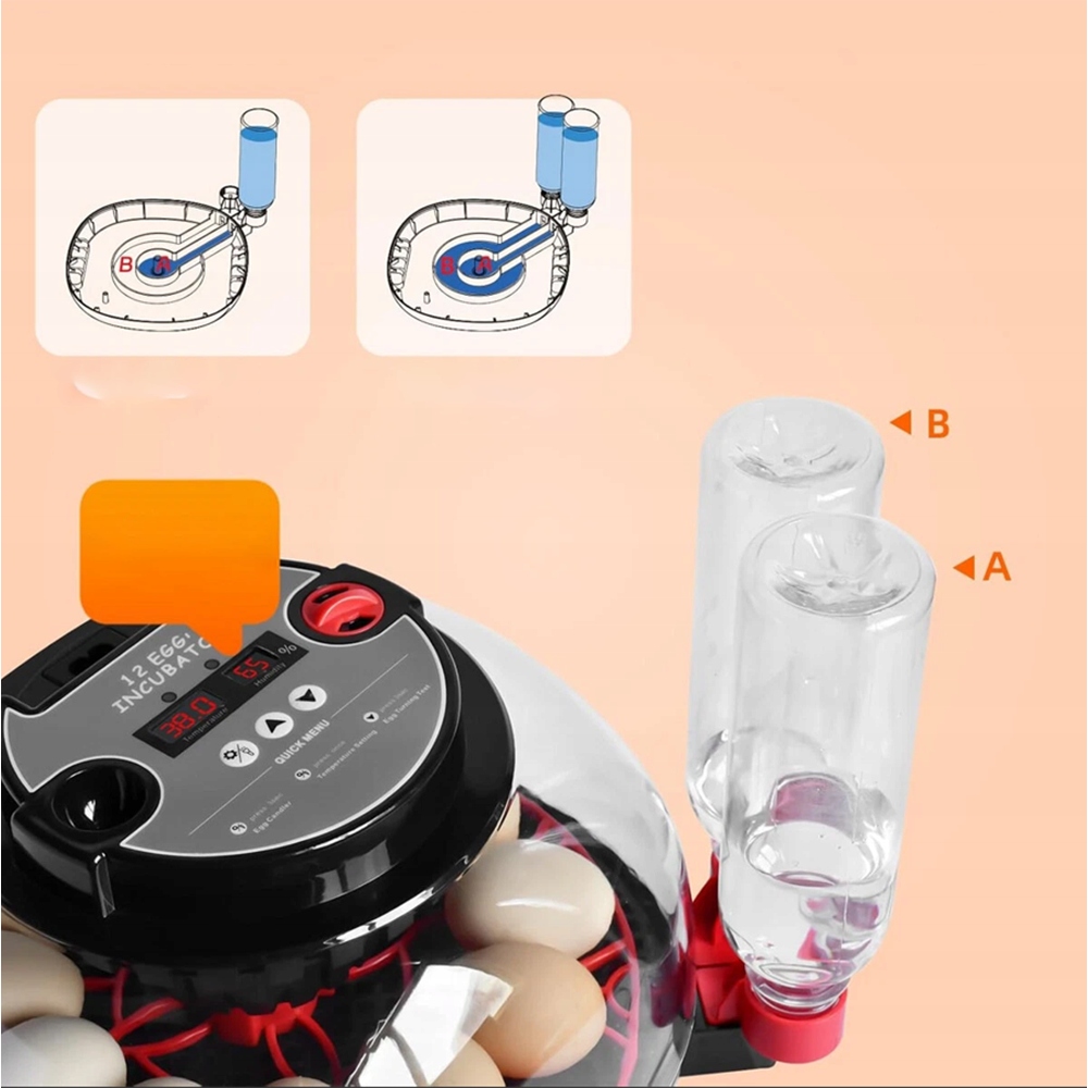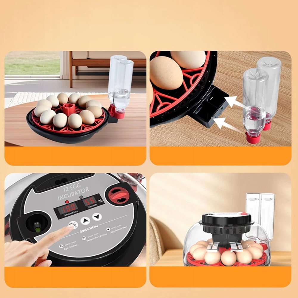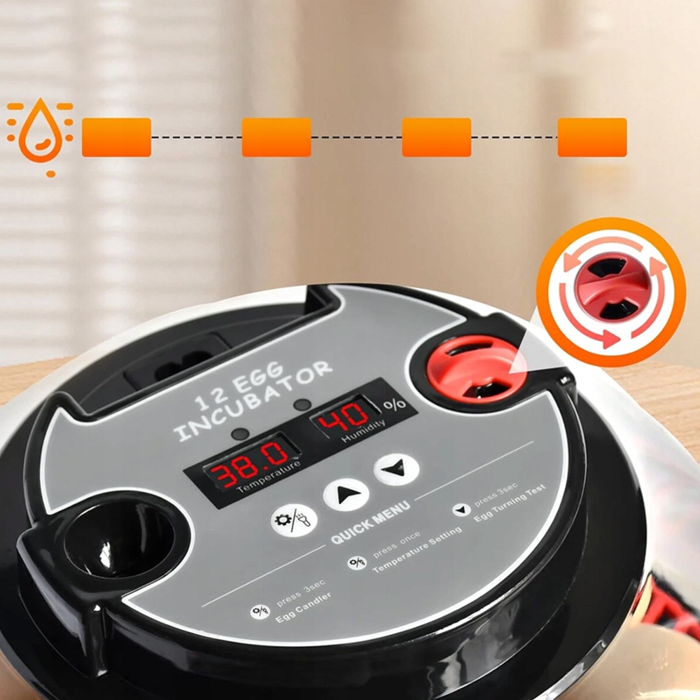 Вбудоване світло для перевірки яєць і дисплей вологості: для спостереження за розвитком яєць додаткова лампа для огляду яєць не потрібна. Крім того, панель керування відображає температуру та вологість, щоб точно контролювати середовище проживання яйця та підвищити успішність висиджування.