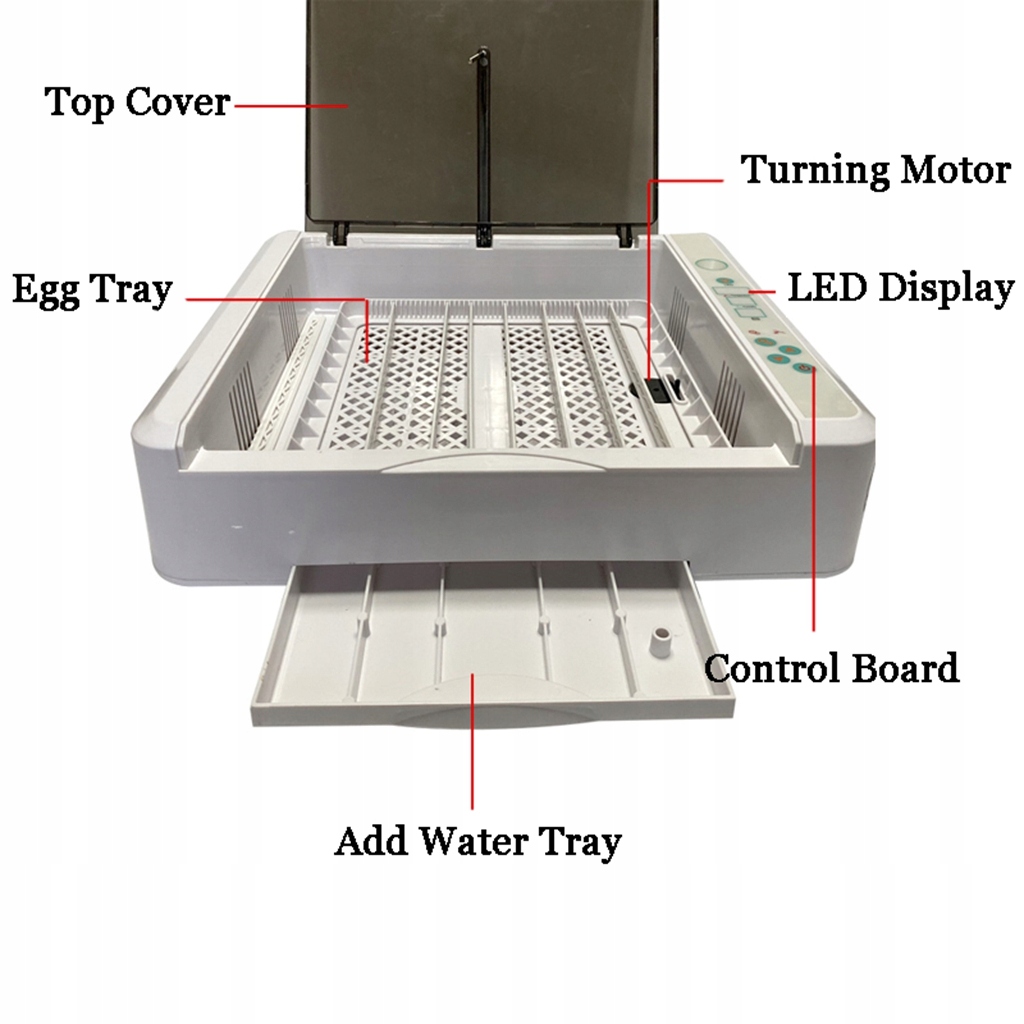 Вільно встановлюйте процедуру, імітуйте природний процес інкубації для покращення швидкості вилуплення; світлодіодна лампа для контролю життєздатності яйцеклітини, легко відстежувати розвиток ембріона; Прозора кришка для зручного огляду без відкриття. Постійна температура і тихі вентилятори - Силіконовий нагрівальний кабель з дизайном повітряного каналу для рівномірного обігріву внутрішнього простору; 2 тихі вентилятори для кращої вентиляції, підтримки заданої температури та забезпечення оптимальних умов для виведення.