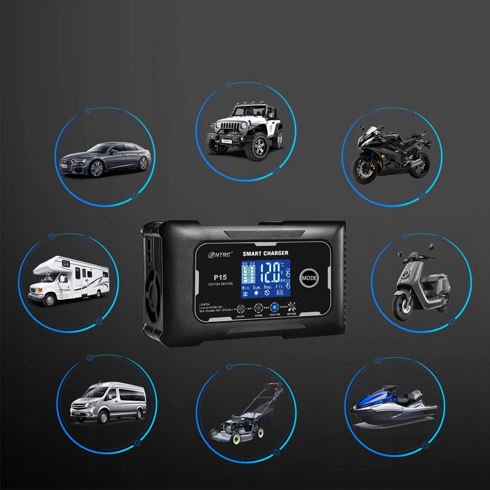 ??? використовувати ??? Зарядний пристрій батареї використовується лише для акумуляторів, що нагадує кислоту 12 В/24 В (AGM, Gel, SLA, VRLA, EFB) та акумуляторами LifePO4, інші типи статуляторів не повинні заряджати. Струм зарядки: Максимум 15А для 12В акумулятора, максимум 10А для 24 В акумулятора. Він широко використовується для забезпечення безпечної та ефективної зарядки автомобілів, мотоциклів, човнів, косарок тощо