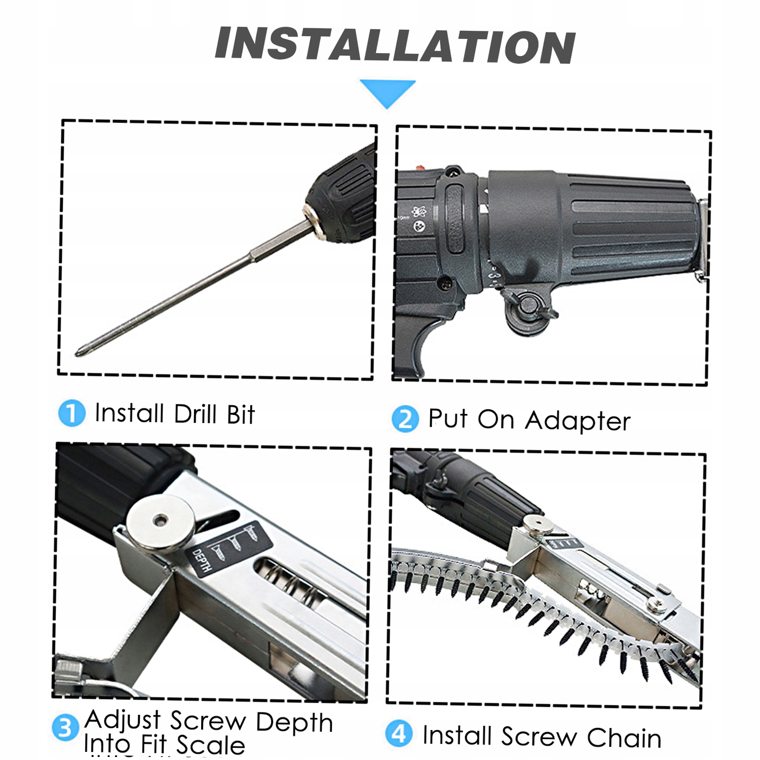- Економічно — можна використовувати різні гвинти. Стрічка для автоматичної викрутки з 50 гвинтами, і всі їх можна замінити, ви можете вставити нові цвяхи після використання. Цей адаптер і ланцюг автоматичної подачі можуть заощадити як час, так і робочу силу.
