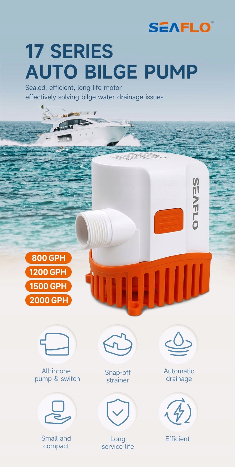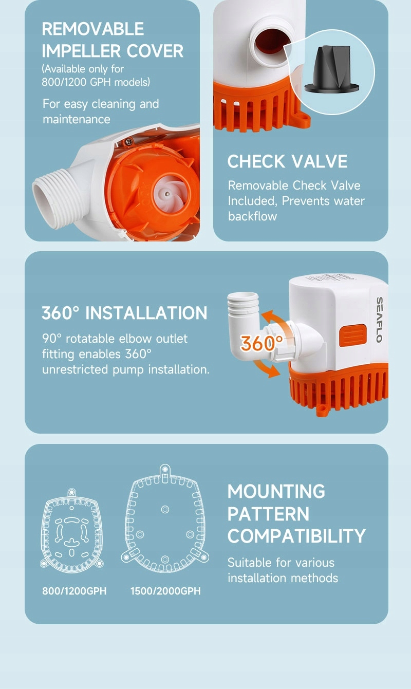 - Висока ефективність - 1200 GPH (галонів на годину), тобто прибл. 75 л/хв, ідеально підходить для ефективного видалення води з трюму човна.