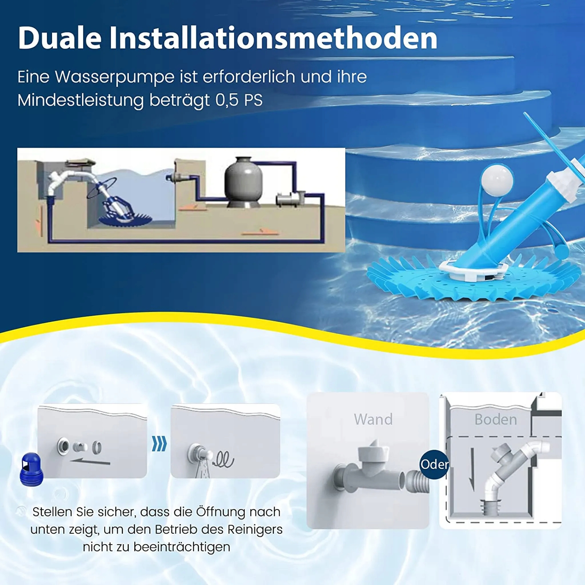 Для складання автоматичного очищувача басейну не потрібні інструменти. В інструкції чітко показано, як зібрати основний корпус і прикріпити його до насоса для басейну (мінімум 1/2 HP). Ви можете відповідно регулювати довжину водяного шланга, швидкість потоку води та плавучість.