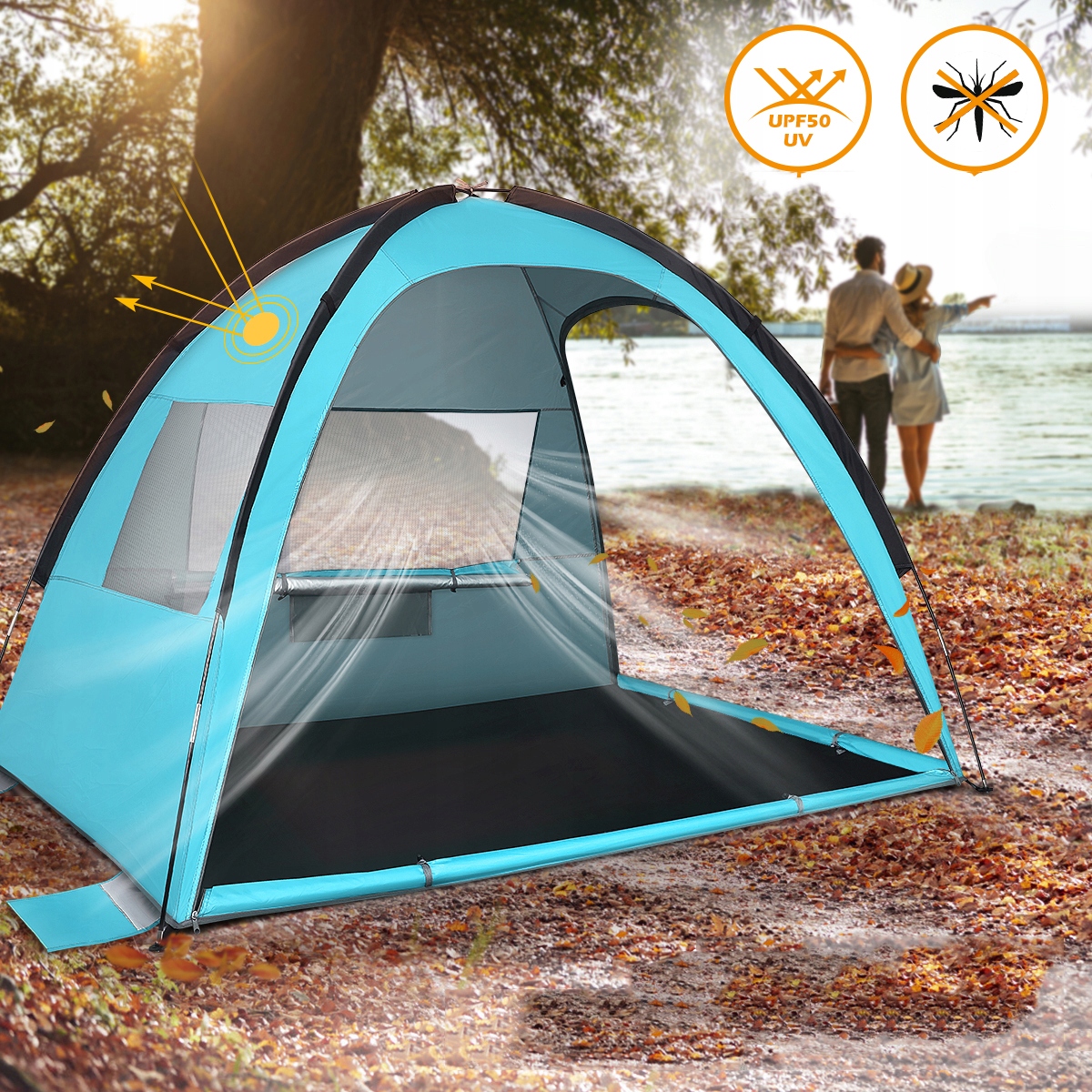 - Цей пляжний намет виготовлений з тканини з покриттям проти ВУ, він може забезпечити вам та вашій родині сильним сонцезахисним кремом під час свят поблизу. І він легкий і може бути складений до невеликого розміру, портативного для подорожі назовні. Завдяки прозорим інструкціям використання, ви можете легко зібрати та демонтувати його.
