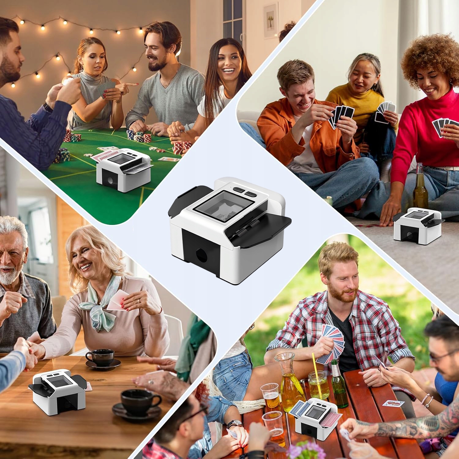 Чи то під час сімейних зборів, відпочинку в офісі чи подорожей чи кемпінгу, професійний шаффлер є ідеальним аксесуаром для гри кількома колодами! Ідеально підходить для людей з проблемами змішування карт, маленькими руками або болем у суглобах. Ви можете насолоджуватися покером будь-коли та будь-де.