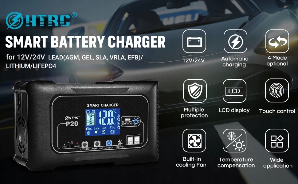 Інтелектуальний зарядний пристрій HTRC є універсальним і ефективним рішенням для заряджання та обслуговування всіх популярних типів акумуляторів 12 В і 24 В. Завдяки максимальній потужності 240 Вт і інтелектуальній електроніці він забезпечує оптимальну та безпечну зарядку свинцево-кислотних акумуляторів, а також сучасних літієвих акумуляторів LiFePO4. Це незамінний інструмент для водіїв, автомобільних ентузіастів і професіоналів.