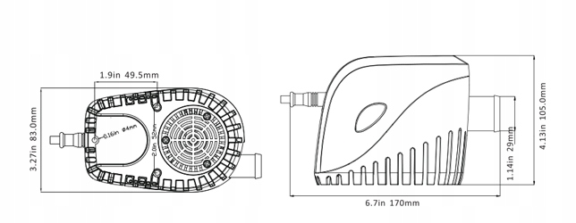 Живиться від 12 В, він досягає продуктивності до 70 л/хв. Завдяки низькому споживанню струму 3 А, він дуже енергозберігаючий, що не змінює його ефективності, оскільки він може піднімати воду до 4 м. Довжина електричного кабелю в комплекті для підключення становить приблизно 1 м. Підключення до каналізації має діаметр 29 мм.