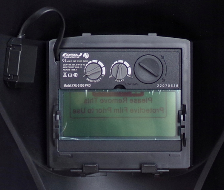 Козирок оснащений зовнішньою ручкою, яка дозволяє регулювати рівень затемнення від 9 до 13 відповідно до DIN. Є можливість регулювати чутливість реакції фотодатчиків на інтенсивність дуги під час зварювання MIG або TIG, а також регулювати час затримки перемикання темного/світлого стану в діапазоні 0,1 - 1,0 с.