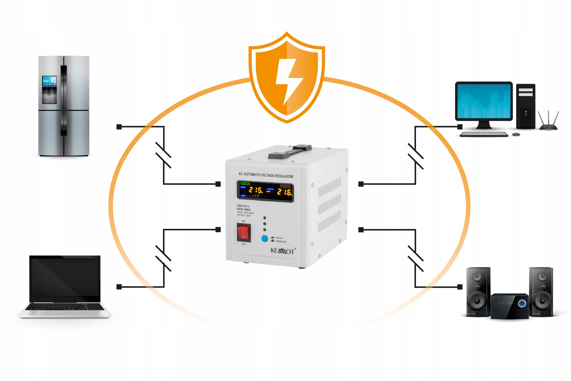 Незалежно від навантаження мережі та коливань вихідної напруги, стабілізатор KEMOT SER-2000 підтримує їх на рівні 230 В ±3%, дозволяючи всім пристроям працювати ефективно, включаючи ці чутливі до якості напруги мережі. Регулювання відбувається автоматично, що забезпечує високу точність вихідної напруги. KEMOT SER-2000 можна використовувати в домашніх і офісних умовах, ідеально підходить для телевізорів і RTV обладнання, а також гучномовців, міні-веж та інших аудіо/відео пристроїв і комп'ютерів.