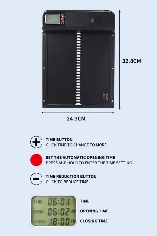 Дверцята курятника мають світлодіодний дисплей і 24-годинний таймер, ви можете регулювати щоденний час відкриття та закриття з точністю до хвилини, тому вам не завжди потрібно турбуватися про безпеку вашого кури