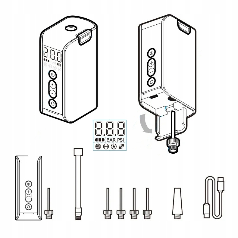 - в комплекті: насос, кабель USB-C – USB-C, 5 кулькових голок, балонний наконечник, шланг