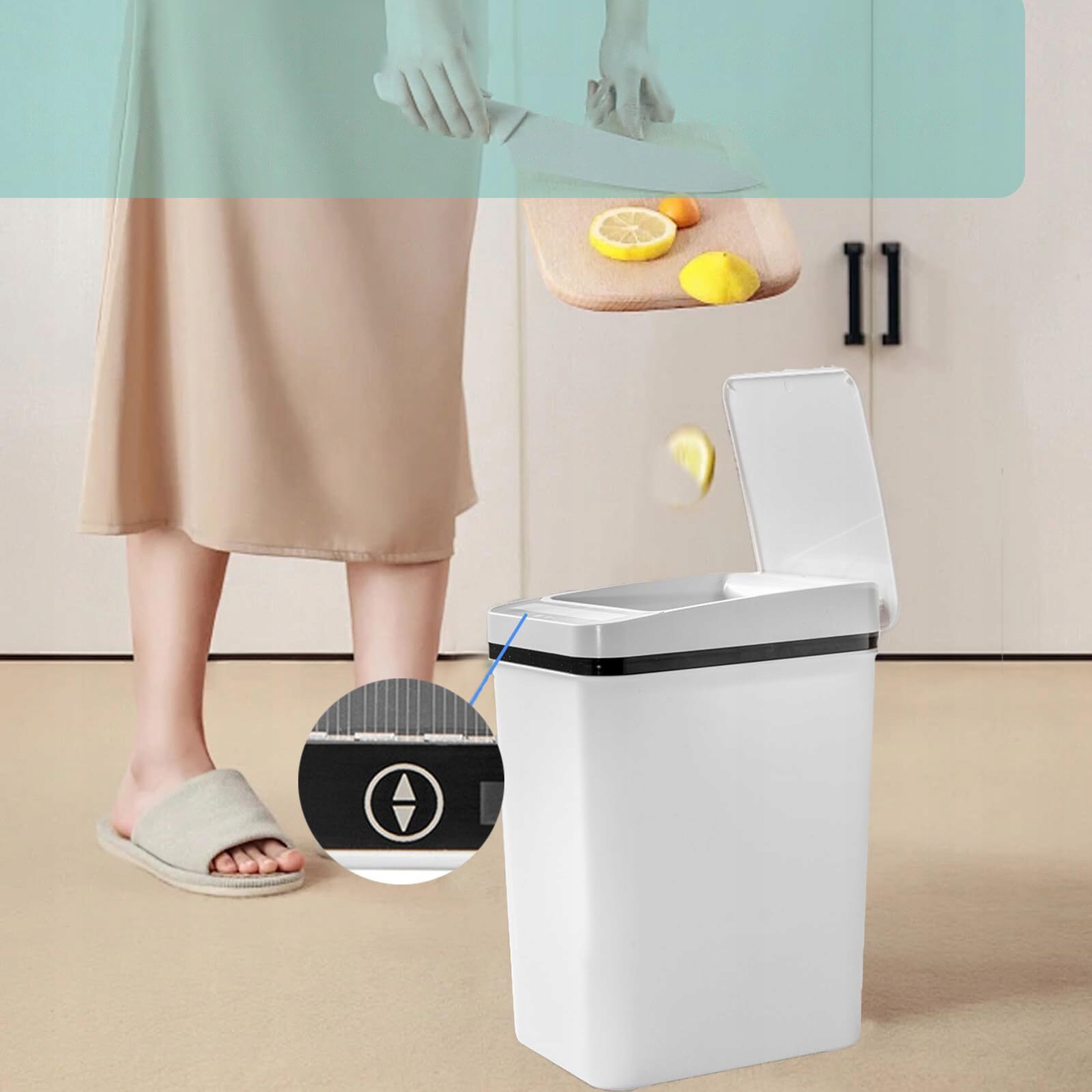 БЕЗКОНТАКШНИЙ КОНДЕР ДЛЯ СМІТТЯ – сміттєвий бак із датчиком руху використовує вдосконалену технологію автоматичного виявлення. Просто помахайте або зігніть коліна над інфрачервоним датчиком, і кришка відкриється за 0,5 секунди. Автоматична урна для сміття оснащена датчиком вібрації. Його можна відкрити, постукавши по кошику або ногою. Розумна конструкція датчика дозволяє без проблем утилізувати сміття, навіть якщо у вас немає вільної руки.