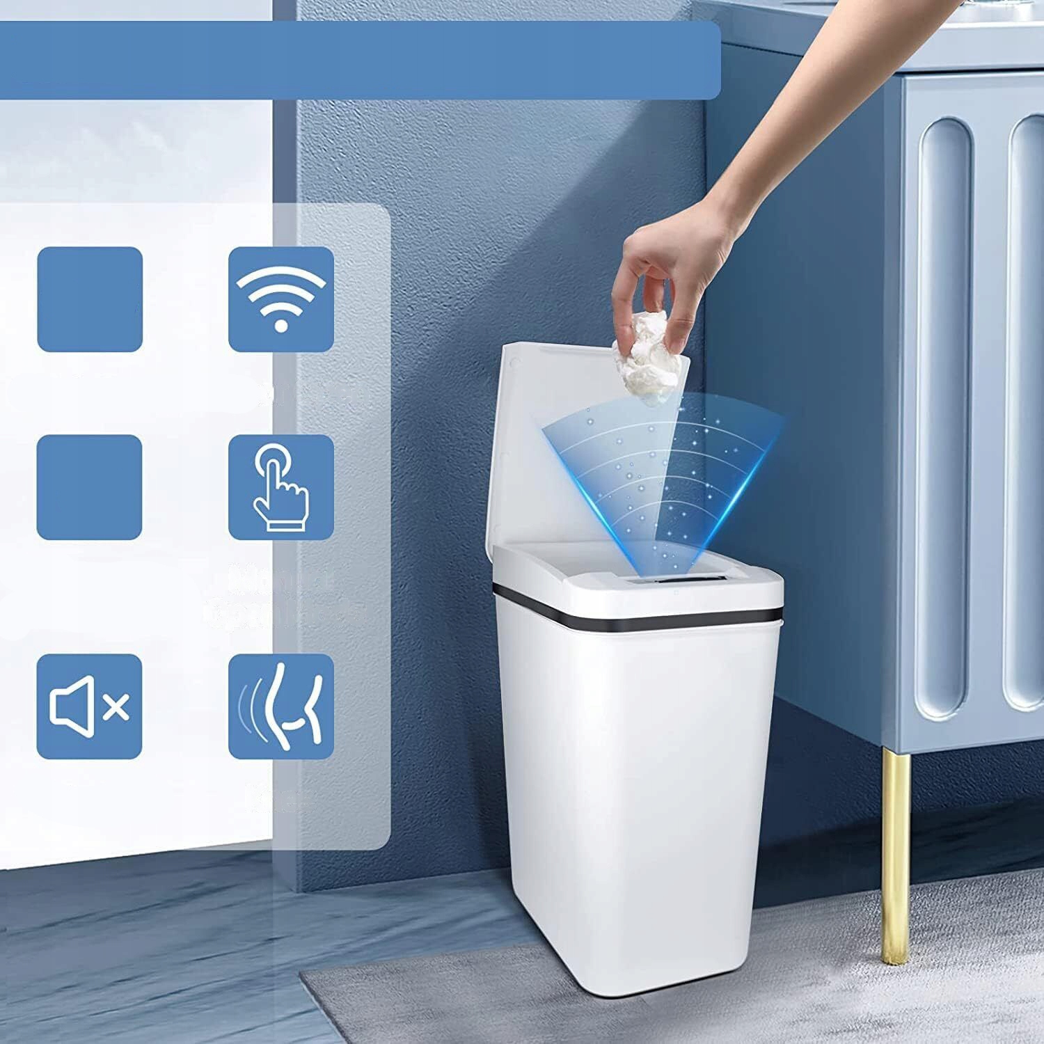 ВОДОСТІЙКИЙ ТА ВОЛОГОЗАХИЩЕНИЙ ДИЗАЙН – наш кошик для сміття з датчиком руху виготовлено з високоякісних матеріалів і має вдосконалений дизайн. Цей автоматичний контейнер для сміття забезпечує точне відкриття та закриття кришки навіть у вологому та захищеному від бризок умовах. Не боїться бризок і немає ризику пошкодити контакт. Тому він ідеально підходить для туалетів, ванних кімнат, віталень і спалень.