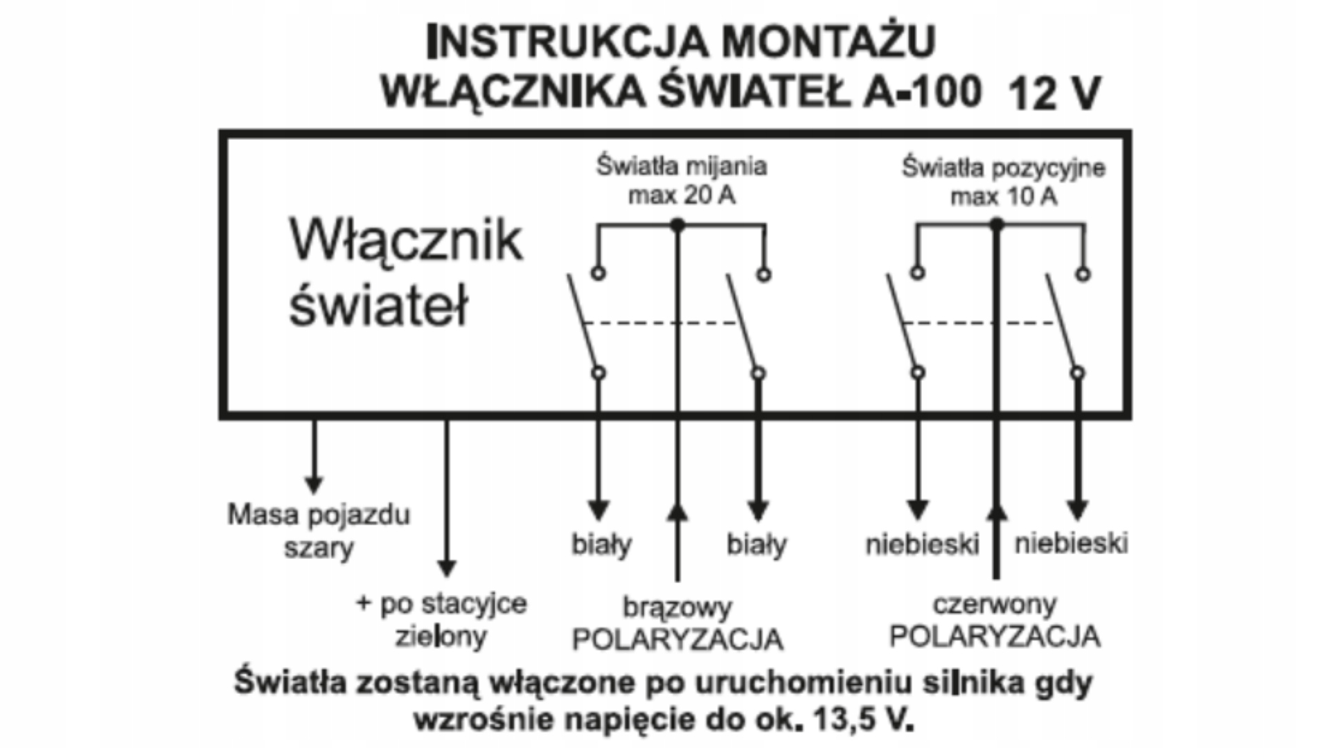 Пристрій, на відміну від більш дешевих конструкцій, в стані очікування не споживає струму. Він переходить в режим очікування тільки після перемикання замка запалювання в положення запалювання, а коли генератор починає заряджатися і напруга в установці перевищує 13,5В, включає світло. Це дозволяє запускати двигун без додаткового, непотрібного навантаження на акумулятор. Автомат також має пам'ять активації, тобто якщо напруга падає нижче порогу зарядки (наприклад, після включення обігріву заднього скла, вентилятора тощо), фари продовжуватимуть горіти. Вони згаснуть лише після вимкнення запалювання. Це запобігає небезпечним ситуаціям на дорозі, коли, наприклад, в результаті тимчасового перепаду напруги, втрати заряду тощо - світло просто вимикається! Пристрій характеризується невеликими габаритами і дуже простою установкою. Рекомендується встановлювати його всередині автомобіля біля заводського вимикача світла або в коробці запобіжників. Якщо установка в цьому місці неможлива, вимикач можна підключити навіть до світильників. В комплекті є інструкція, в якій все детально описано, а при необхідності можу допомогти по телефону або електронною поштою. Пристрій має два незалежних входи для поляризації, тому може керувати світлом будь-яким вибраним способом: