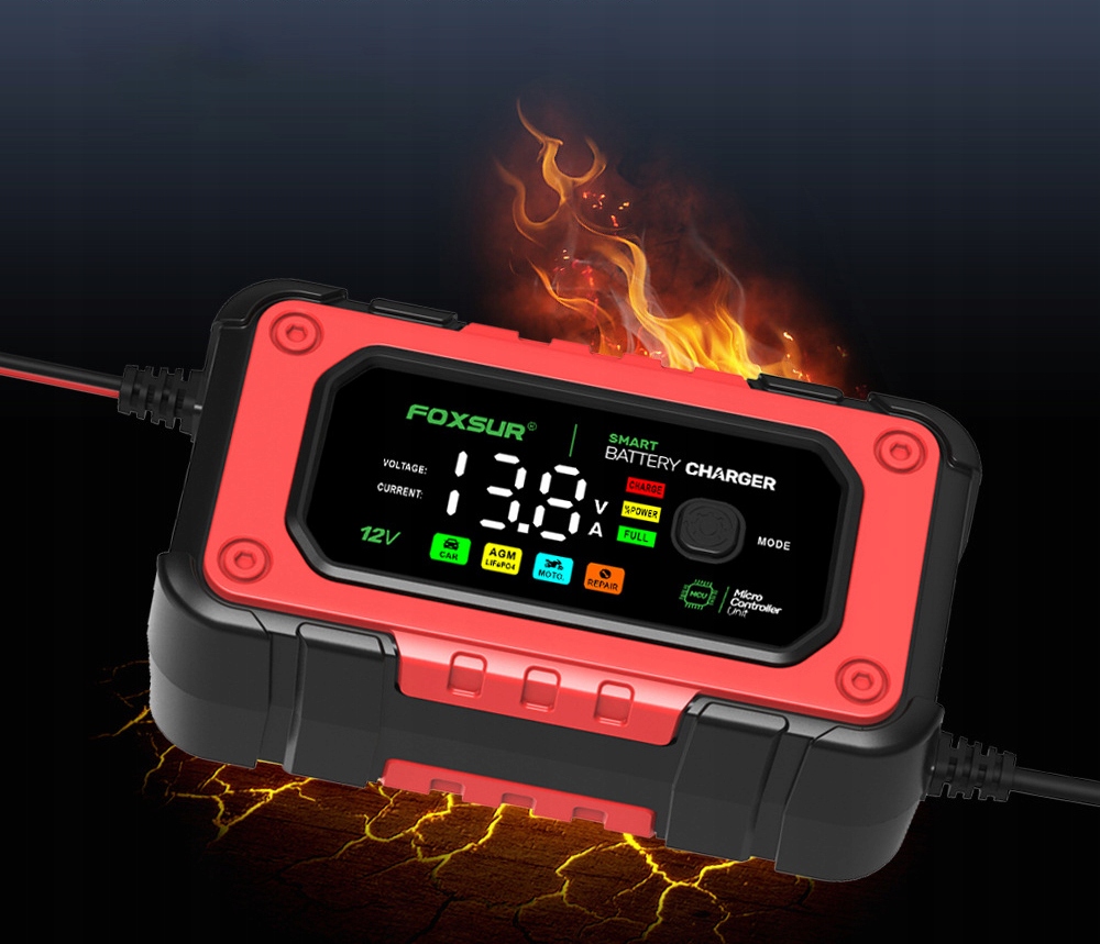 - Автомобільний зарядний пристрій для 12V 6A-7A мотоциклів, автомобілів, позашляховиків і сухих акумуляторів, водяних акумуляторів, свинцево-кислотних акумуляторів, необслуговуваних акумуляторів LiFePO4. необслуговувана батарея LiFePO4.