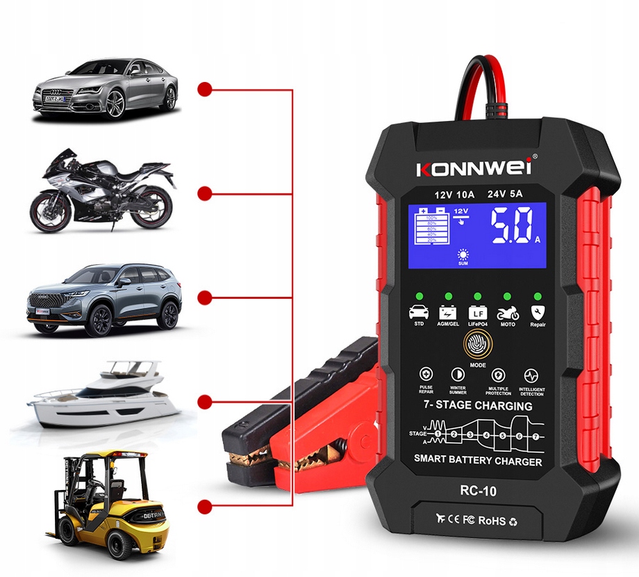 RC-10 від KONNWEI — це потужний зарядний пристрій, який забезпечує зарядку 12 В 10 А та 24 В 5 А.