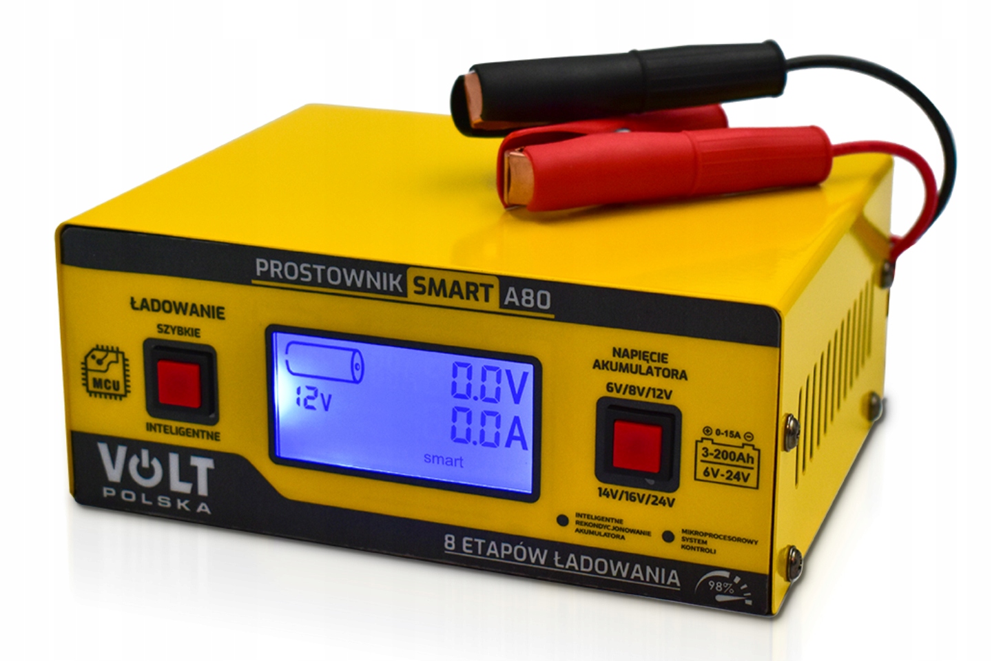 Випрямляч A80 від VOLT Polska є першим на ринку зарядним пристроєм з мікропроцесорною системою управління за технологією ШІМ з можливістю заряджання акумуляторів до 24 В і можливістю вибору нестандартних типів напруги акумуляторів. Завдяки цьому зарядний пристрій розумно та точно підбере відповідні параметри, які забезпечать відновлення розрядженого та залишеного акумулятора.