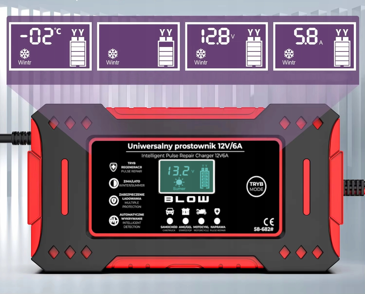Залежно від визначеної температури на екрані буде виділено відповідний значок, і зарядний пристрій оптимально заряджатиме підключений автомобіль/пристрій. Випрямляч адаптований до важких умов.