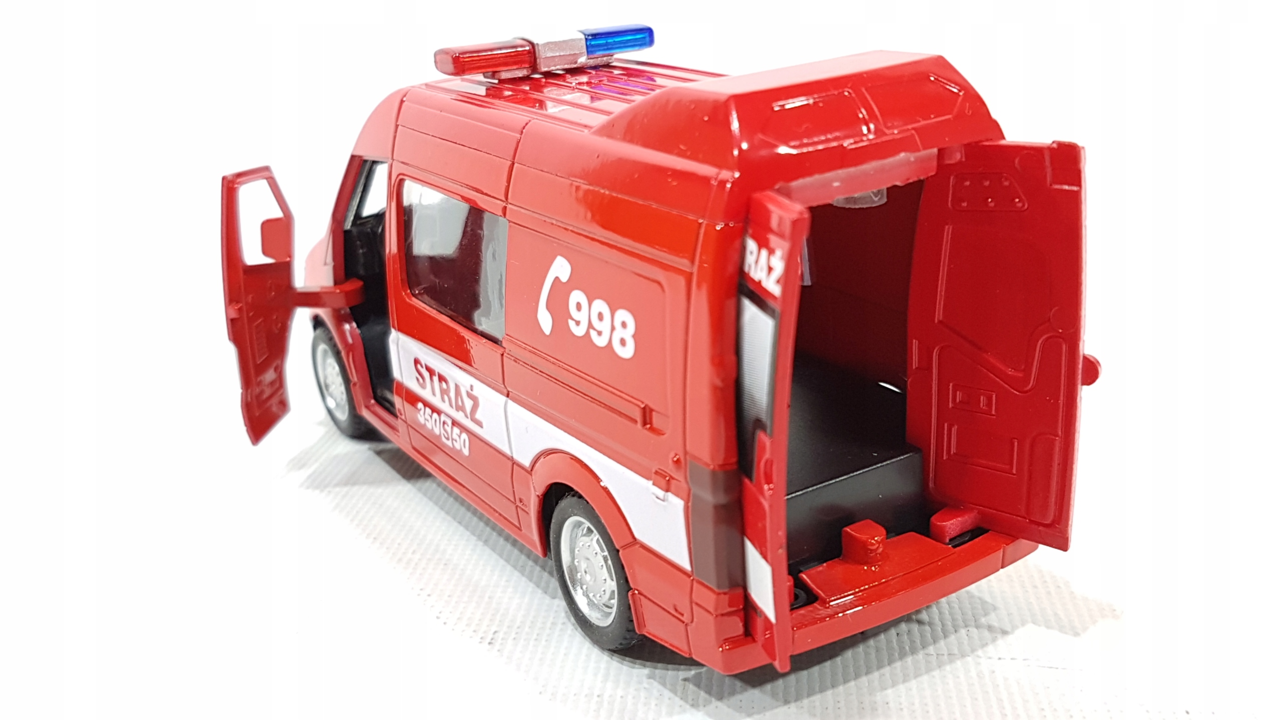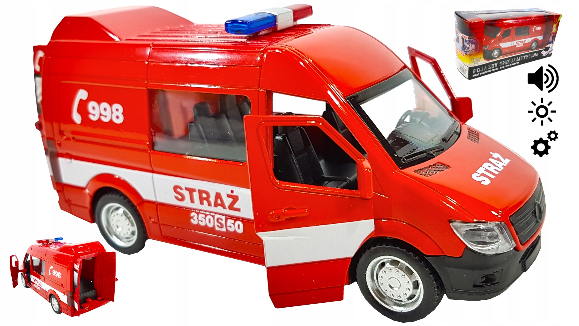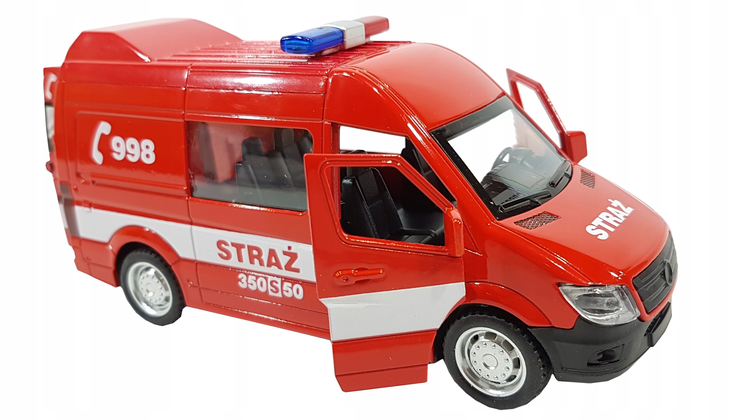Пожежний автобус з польськими написами, акуратно виготовлений з металевих і пластикових частин, відображає зовнішній вигляд справжнього автомобіля MERCEDES SPRINTER.