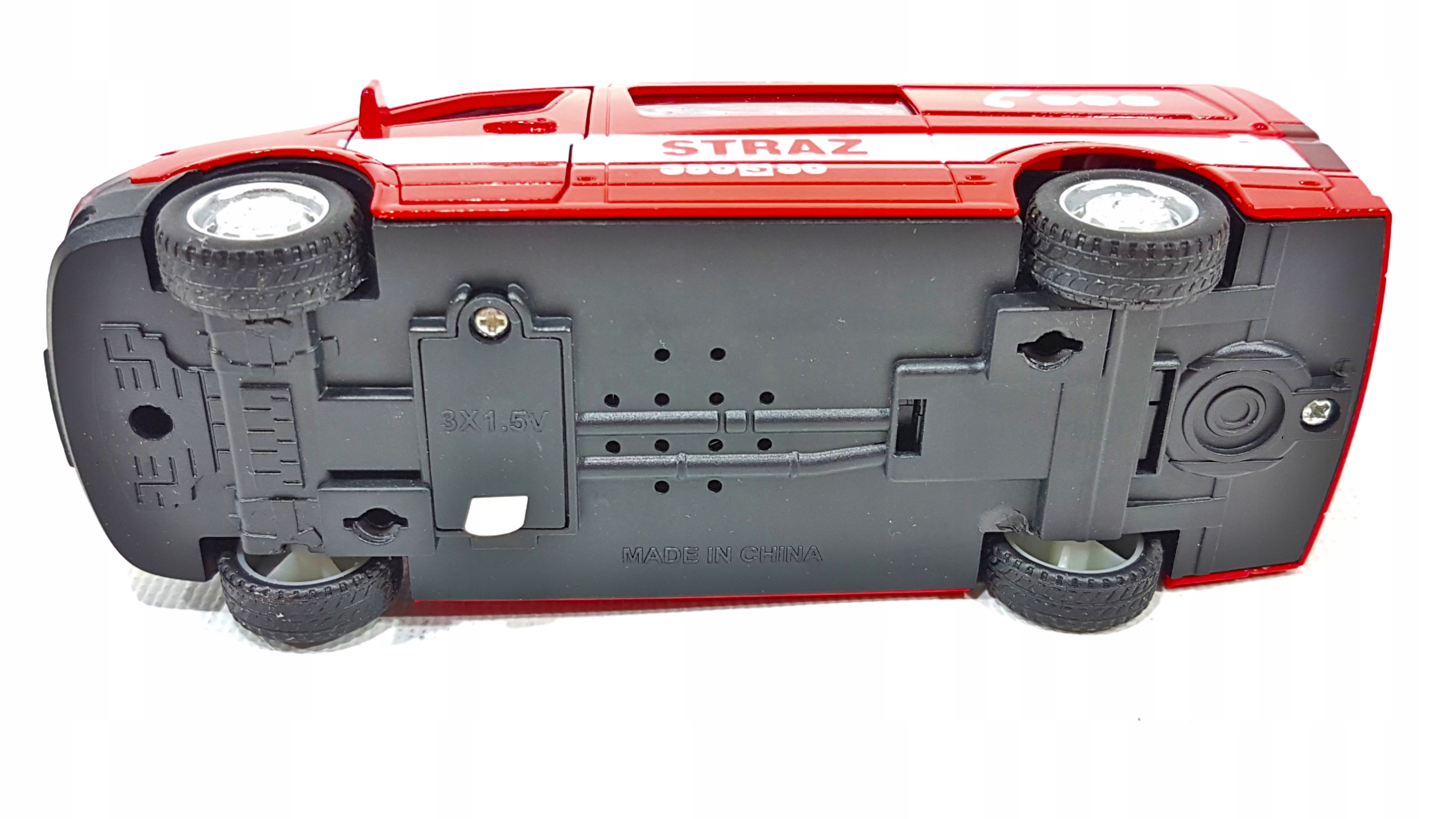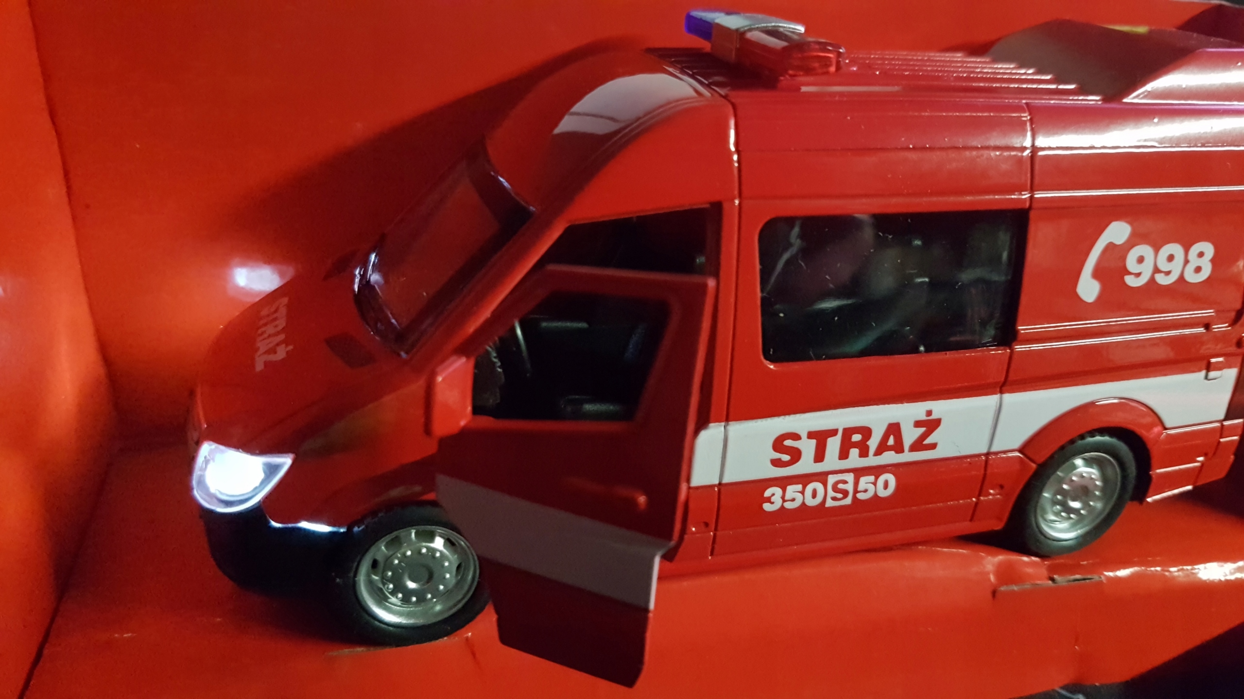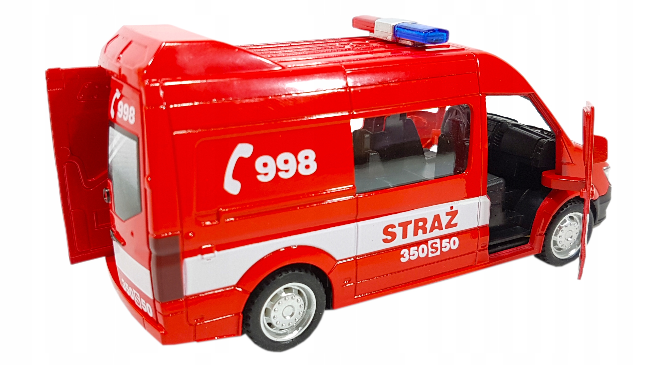 Пожежний автобус з польськими написами, акуратно виготовлений з металевих і пластикових частин, відображає зовнішній вигляд справжнього автомобіля MERCEDES SPRINTER.